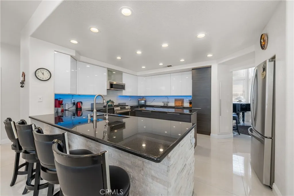The heart of the home is the modern chef’s kitchen, featuring Galaxy Black countertops, sleek designer cabinetry, upgraded stainless-steel appliances, and abundant storage. The adjoining breakfast nook and family room flow seamlessly together, perfect for both entertaining and everyday living.