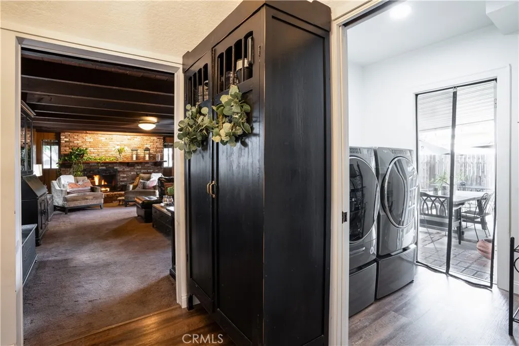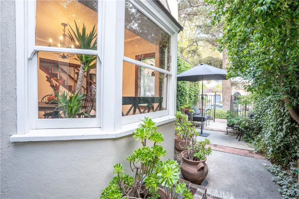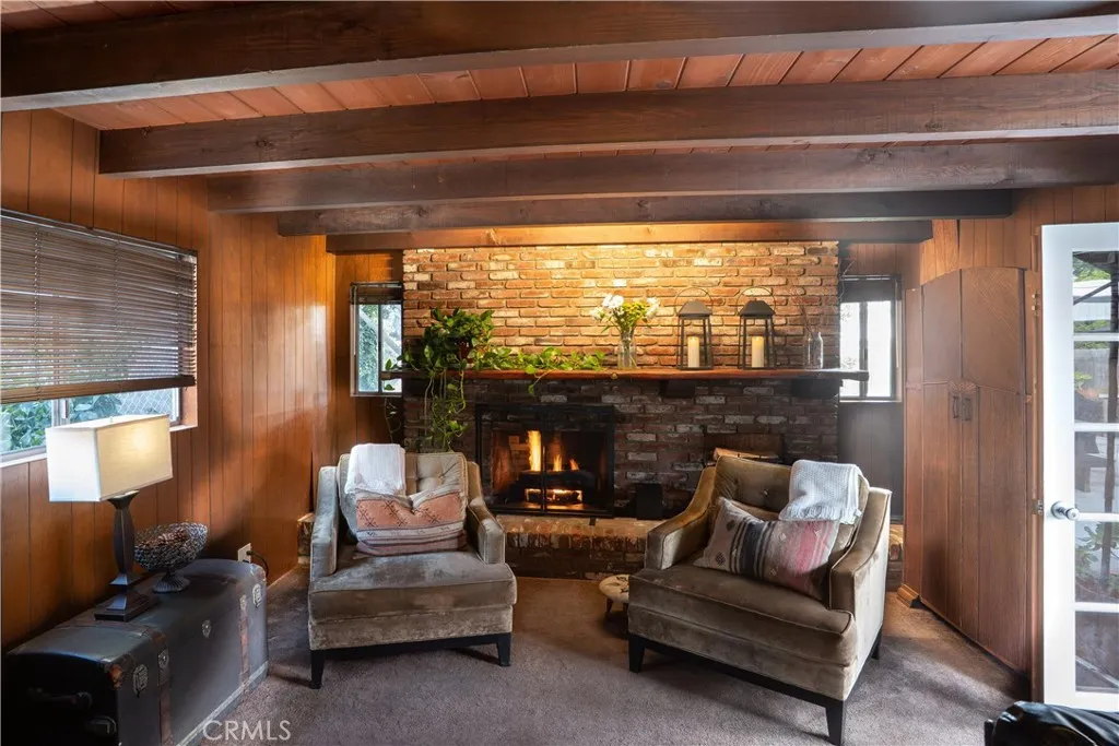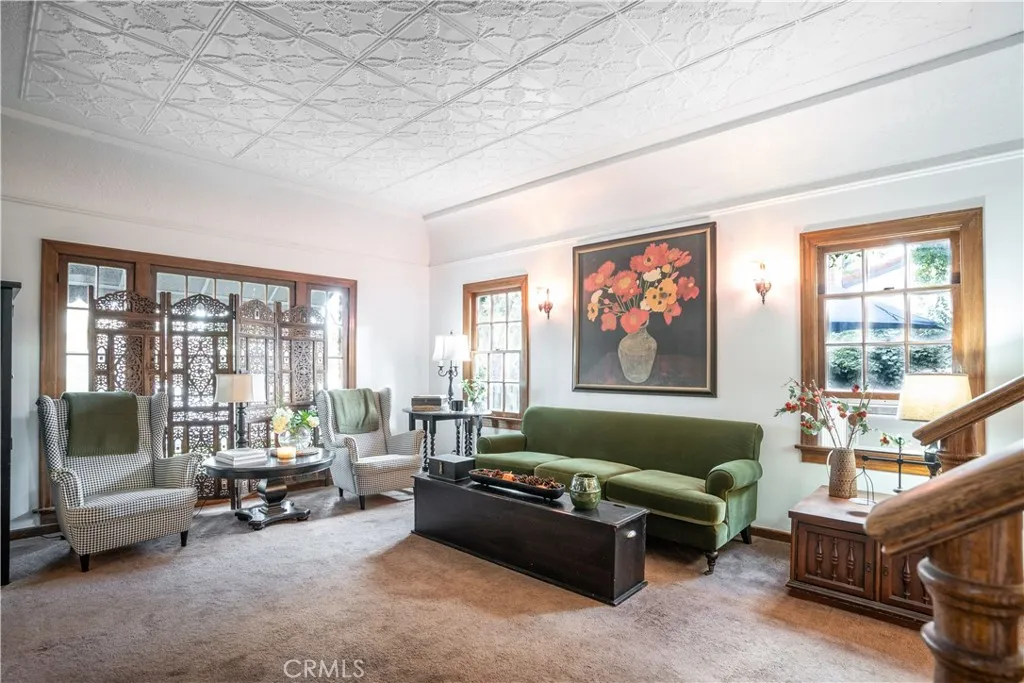 Step into this timeless 1926 Tudor Revival, blending architectural detail with tasteful modern updates. Just a short walk to charming local shops and restaurants. The dramatic living room features high coved ceilings, vintage pressed-tin ceiling panels, and original mahogany trim. The adjacent formal dining room includes a character-rich bay window and warm wood accents. A separate office/study/library with vaulted ceiling includes a built-in mahogany bookcase, drop-down desk, and spacious drawers. The entry door is original mahogany with an inlaid beveled oval glass window—a true one-of-a-kind. The updated kitchen boasts granite countertops, ebony cabinetry with pull-out drawers, and modern appliances, leading to a cozy breakfast nook and adjacent laundry room. Downstairs offers 2 bedrooms and a remodeled full bath. The highlight is a spacious rear family room with beamed ceilings, a brick gas fireplace with heat-exchanger insert, rustic wood mantel, and French doors opening to a private backyard with two covered patios. Upstairs features two generously sized bedrooms with vaulted ceilings, walk-in closets, and a remodeled full bath (2023). Additional features include: Two covered rear patios, ideal for entertaining, block wall for added privacy, detached 3-car garage or 2-car + finished hobby room with upstairs loft (studio or storage). Lovingly maintained and thoughtfully updated, this rare gem offers vintage elegance, flexible space, and a prime location in one of Long Beach’s most beloved historic neighborhoods.