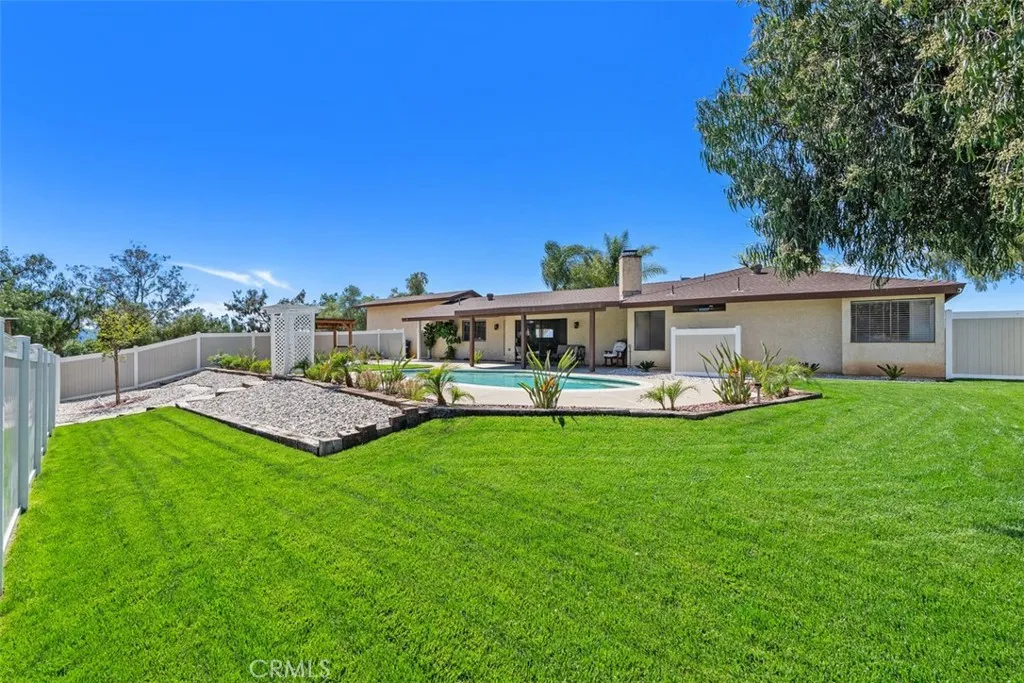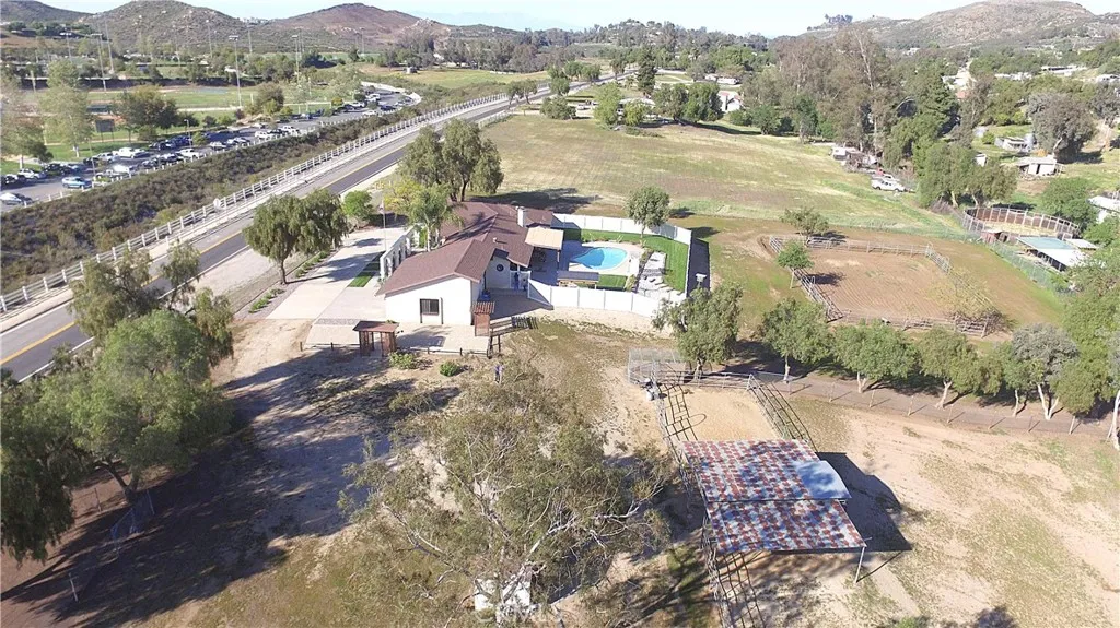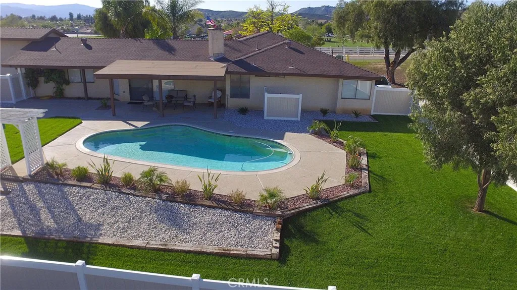 Welcome to this exceptional Murrieta estate—a custom single-story oasis set on 3.26 acres of peaceful, well-maintained land that offers the perfect blend of natural beauty, usable space, and a lifestyle designed for both relaxation and recreation. This meticulously remodeled single-story home offers a harmonious blend of modern luxury and serene country living. The open-concept design is accentuated by a stunning tongue-and-groove wood beam ceiling and a floor to ceiling stone fireplace in the living room that adds warmth and natural beauty to the space, bench window seating, new stainless steel appliances, granite countertops and high-end finishes chosen with impeccable taste. Freshly painted and thoughtfully upgraded, the home features luxury vinyl flooring, soft carpet in the bedrooms, new baseboards throughout. Featuring 3 spacious bedrooms and 2.5 nicely updated bathrooms. The bedrooms are oversized, including a luxurious primary suite with a generous walk-in closet. Both full bathrooms feature double sink vanities. New window coverings are installed throughout the home for a clean, finished look. Step outside to your private backyard paradise, professionally landscaped to perfection. Dive into the sparkling swimming pool, relax under the patio, or cook under the stylish cabana and entertain guests in this idyllic setting. The backyard is beautifully enclosed with vinyl fencing, creating a safe and private outdoor sanctuary. The entire 3.26-acre property is surrounded by secure chain-link fencing, providing peace of mind and space for RVs, boats, trailers, and all your recreational toys. A three-car garage and storage shed add convenience and flexibility. Equestrian enthusiasts will appreciate the riding arena and pipe corrals, offering plenty of room for horses and the potential to expand. A charming seasonal creek meanders through the property, complete with a bridge crossing, and is adorned with mature walnut, pepper, and eucalyptus trees, creating a tranquil and shaded environment. All landscaping is on a water-efficient drip system, including an automatic setup for the yards. Close to parks and located in the highly-rated Murrieta Valley Unified School District. With ADU potential, serviced by a private well with optional city water connection available, no HOA, and close proximity to shopping, restaurants, and hospitals, this Murrieta gem has it all.