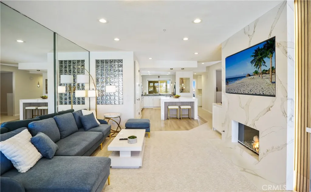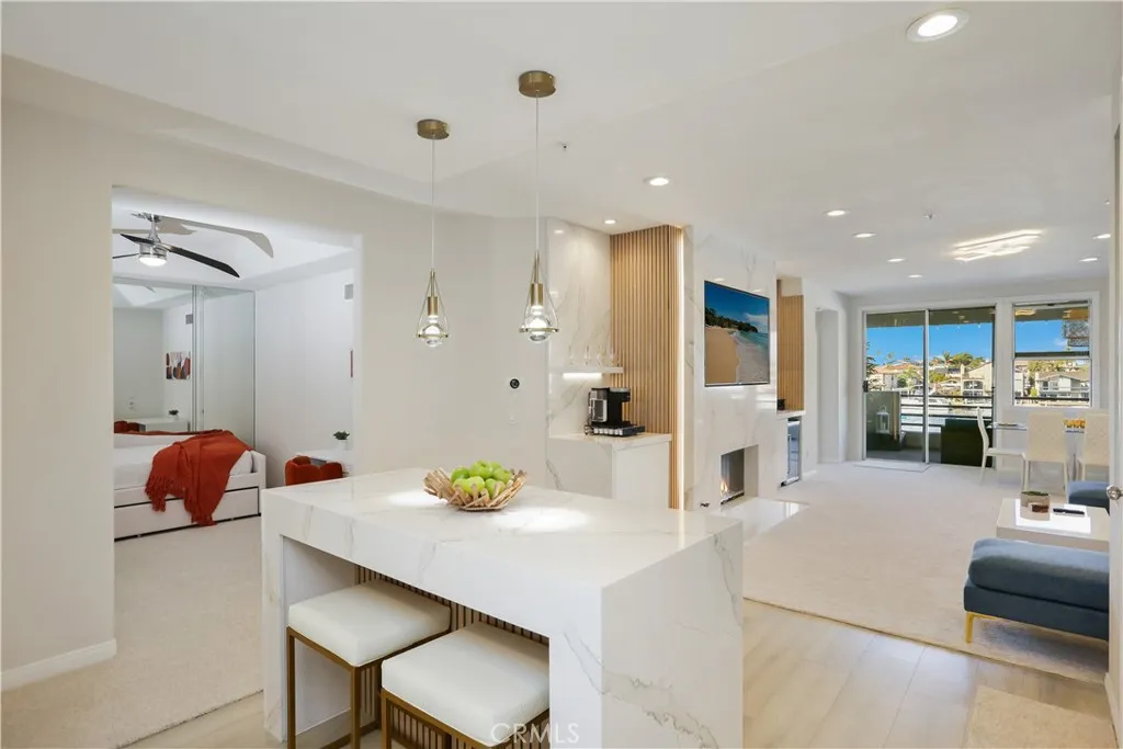 The open-concept layout features a fully remodeled gourmet kitchen with a marble center island, modern cabinetry with hidden notches, and a custom marble/wood coffee station with wine fridge—flowing seamlessly into the living and dining areas.