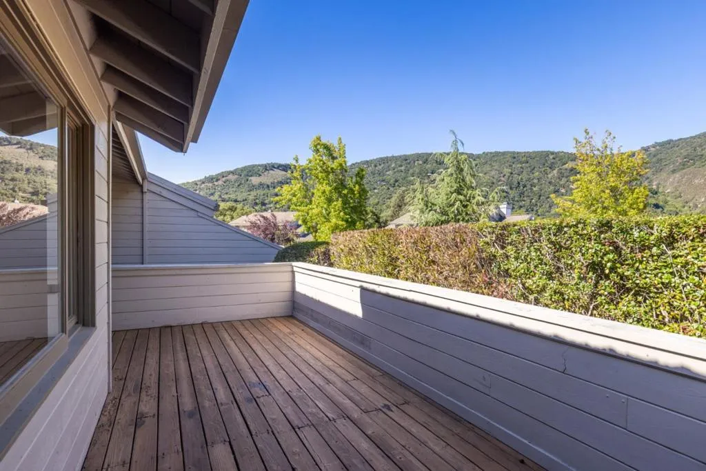 Seller Financing available. Enchanting White Oaks Condo complex in the heart of Carmel Valley Village…Large 2,165 sf Condo located at the apex of the complex on the inner circle with breathtaking mountain views and very private setting. On the market for the first time in 23 years. Master suite downstairs with sliding door to private courtyard. Second level Loft can be used as a den, office or hobby area adjacent to the second bedroom suite. Living room with tall, vaulted ceilings, gas starter wood burning fireplace, built in bookshelves, large windows with astonishing views of the mountains, and sliding door to very private rear fenced mountain view Deck. Formal dining area adjacent to living room and kitchen with large, mountain-view windows. Large open kitchen with Peninsula counter for cooking large meals and adjacent large casual dining room both in refinished hard wood floors. New carpets, new paint, new stainless steel appliance suite, new electrical panel, new compliant toilets, and finished two car garage. Small quite complex with only 30 units has Clubhouse and Pool. Seller Financing available.