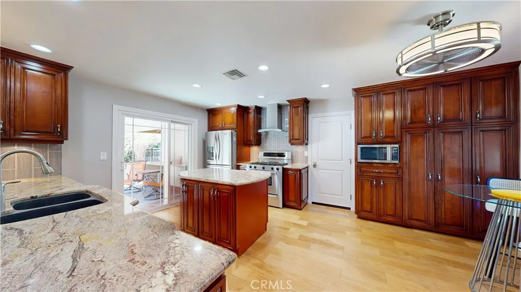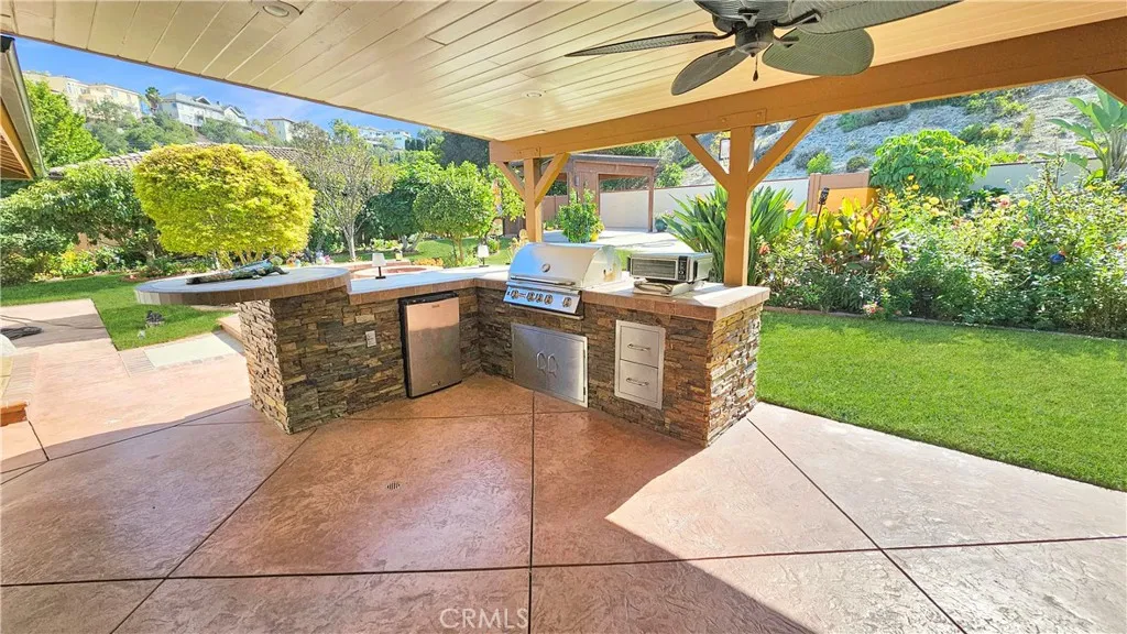 The home features paid-off solar panels, an open and inviting floor plan, upgraded flooring, recessed lighting, and a stunning remodeled kitchen and bathrooms. Step outside to your exceptionally private backyard oasis, perfect for entertaining — complete with a sparkling pool, a custom outdoor kitchen, a gas fire pit, a built-in grill, and a covered patio ideal for year-round gatherings.