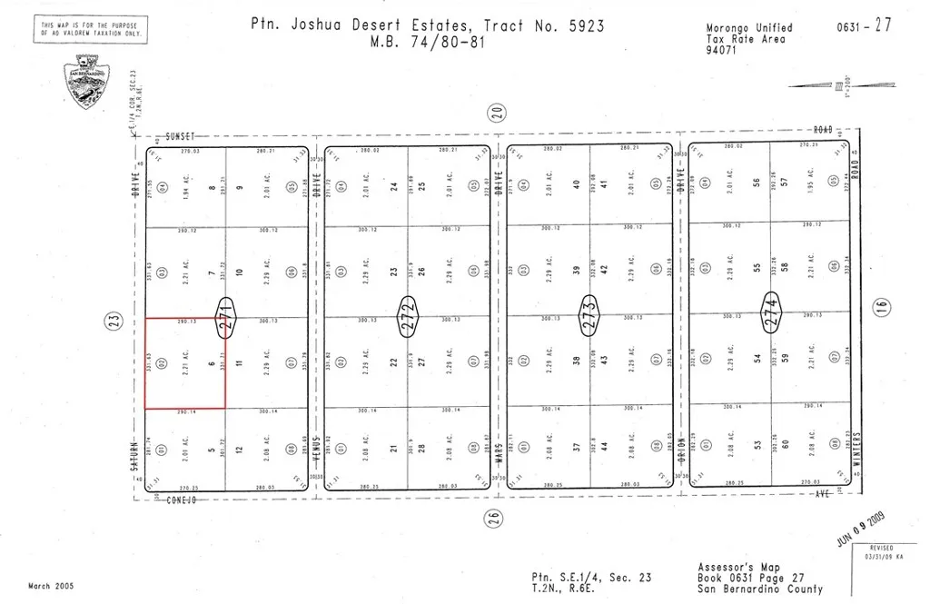 Exceptional 2.21-acre desert retreat on Saturn Drive offering unlimited potential for off-grid living or investment property. This flat, buildable parcel features typical Mojave desert vegetation and sits in unincorporated San Bernardino County with residential zoning allowing custom home construction, ADUs, and agricultural activities. Dirt road access provides privacy while maintaining connectivity to Highway 62 corridor. Power lines located approximately 650 feet away at Saturn Drive and Sunset Road intersection – buyer to verify all utility connections and costs. Property benefits from Joshua Basin Water District service area and excellent cell coverage for remote work capability. Located minutes from park entrance, this vacant land offers dark sky stargazing, hiking access, and investment upside in California’s fastest-growing desert community. Perfect for buyers seeking acreage, privacy, and proximity to outdoor recreation. Joshua Tree’s buyer-friendly market with 38.7% projected job growth creates ideal acquisition timing. APN 0631-271-02-0000. GPS coordinates 34.24367, -116.31928 provide precise location for site visits. Zoning allows residential development with proper permits. Ready for your vision – whether vacation retreat, permanent residence, or rental investment. Contact for utility verification details and development guidance.