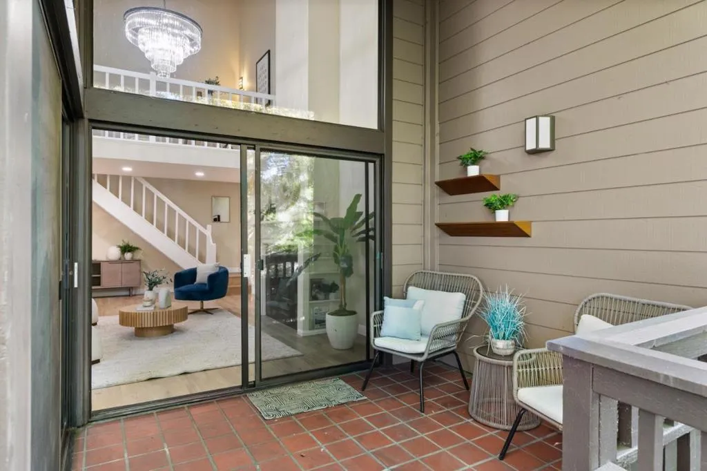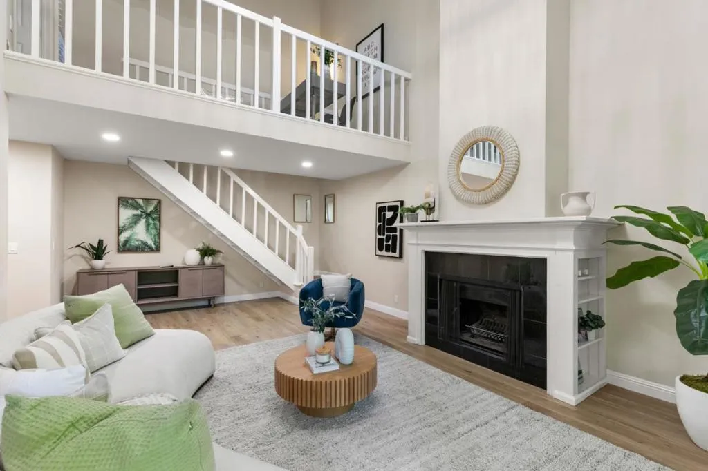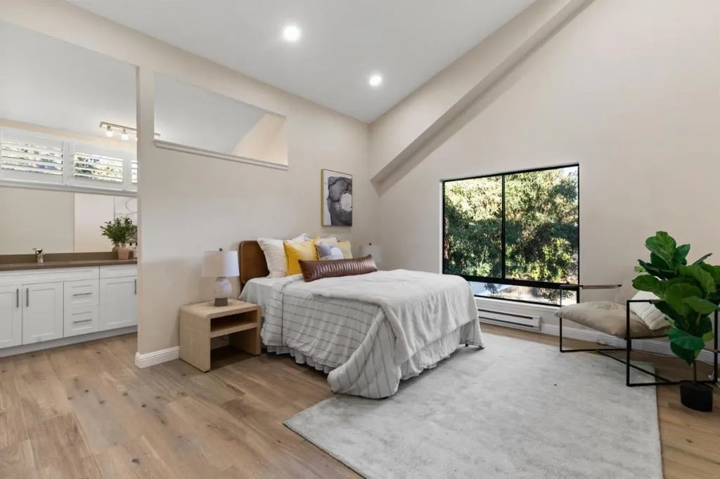 Welcome to this spacious and beautifully updated 1,884 sq. ft. home in a quiet, tree-lined Mountain View community. With 3 bedrooms and 3 baths, including a rare dual-primary setup, it offers both comfort and flexibility. The main level features 2 bedrooms and 2 baths, while the upper level includes a private suite and loft, perfect for a home office. The bright living room boasts soaring ceilings, oversized windows, and a cozy fireplace. Three sliding glass doors lead to a shaded deck for seamless indoor-outdoor living. Enjoy a remodeled kitchen with quartz countertops, stainless steel appliances, and quality cabinetry, plus new flooring and plush carpet throughout. Additional features include indoor laundry, solar panels, and an HOA that covers water, hot water, sewer, and more. Ideally located in Mountain View near shopping, dining, major freeways, and top-rated Los Altos High School, this home offers the perfect blend of space, style, and convenience.