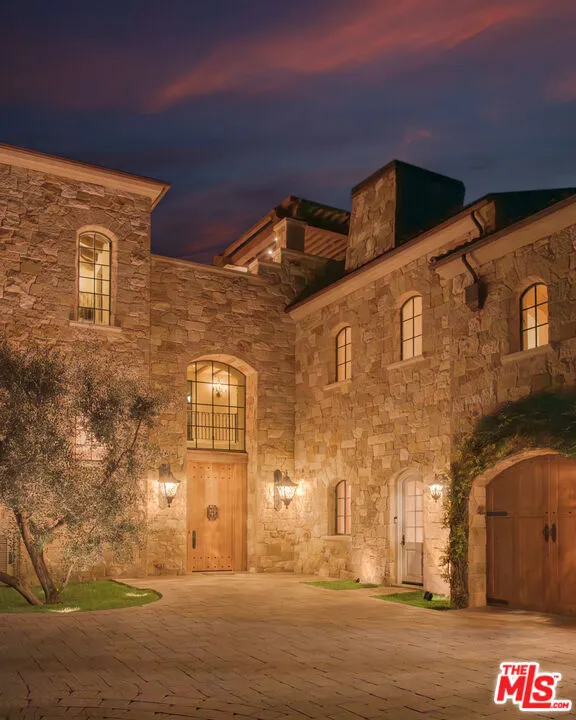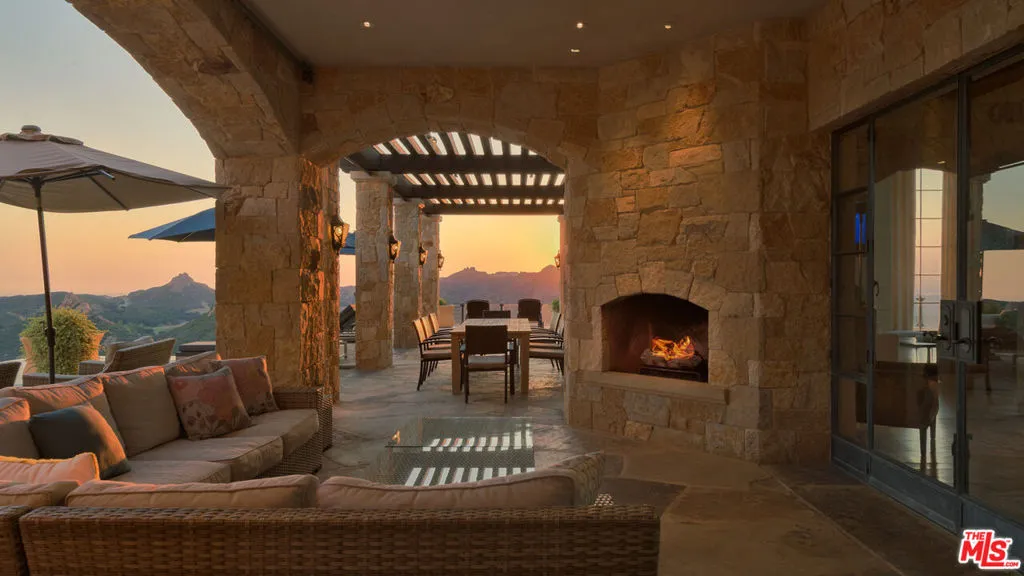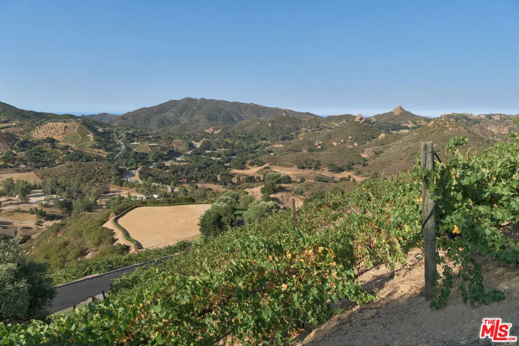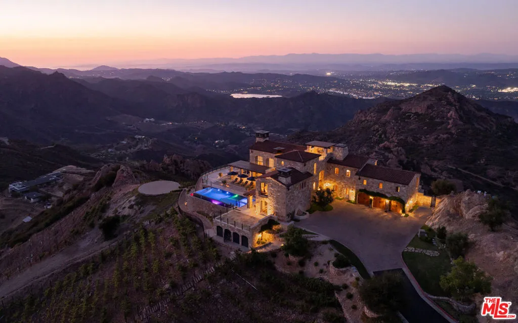 Set high above Malibu’s celebrated wine country, Rocky Oaks Estate crowns more than 37 acres of rolling vineyards and dramatic canyon ridges, offering an extraordinary blend of privacy, grandeur, and natural beauty. Approached through stately wrought-iron gates and a sweeping driveway, the residence occupies a commanding knoll with uninterrupted vistas stretching from the Pacific Ocean to the surrounding mountains. Designed by acclaimed architect Bob Easton, AIA, this Tuscan-inspired villa spans over 7,600 square feet and is finished in timeless stonework that evokes European craftsmanship. Inside, soaring ceilings, walls of glass, and refined proportions create a setting that is both elegant and inviting. A dramatic great room with a cathedral ceiling and monumental fireplace flows effortlessly onto expansive terraces that frame the panorama. The formal dining room, professional-grade chef’s kitchen with butler’s pantry, and multiple gathering areas make the home ideal for both intimate living and grand entertaining. The primary suite is a private retreat with its own terrace and fireplace, spa-inspired bath, and dual dressing rooms, while three additional guest suites, staff quarters, and a media room ensure comfort for family and visitors. An elevator, three-car garage with ample guest parking, and a rooftop observation deck offering 360-degree views elevate the lifestyle experience.Outdoors, the estate is a sanctuary of leisure and beauty. Wraparound loggias with fireplaces, a dining pavilion, an infinity-edge pool and spa, and a circular observation pad invite year-round enjoyment of Malibu’s climate. Nearly five acres of the estate are dedicated to the Rocky Oaks Vineyard, established in 2003 and now one of the most renowned vineyards within the Malibu Coast American Viticultural Area. Producing award-winning varietals recognized for their exceptional quality, the vineyard carries forward a legacy of winemaking that dates to the early 1800s in this region. Rocky Oaks Estate is more than a residence- it is a landmark of architectural vision, viticultural excellence, and Malibu prestige, awaiting its next discerning steward. This home is being offered in partnership with Paramount Realty USA. Seller may accept or reject offers at any time. Visit Paramount Realty USA’s website for full terms and details.