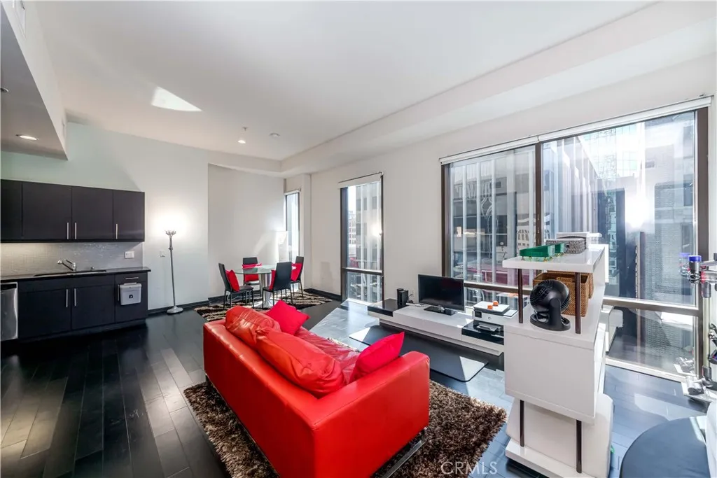 Immerse yourself in the ultimate urban lifestyle with this exceptional residence at the astounding 655 Hope Condos! Head to the tenth floor and discover a stunning studio unit with a high tray ceiling in the main living area, canned lighting, and dark accents that complement the plank floors. Sweeping cityscapes are framed by tall picture windows that fill the dwelling with brilliant light and are equipped with custom blinds for privacy. Relax amidst the open-concept interior or create signature recipes in the corner kitchen with its stainless steel appliances, abundant cabinetry, chic backsplash, and gleaming granite countertops. A large mirrored closet accommodates your sleeping area, while a refreshing bath is beautifully accented with stone tilework around the vanity and shower/tub combo. Other notables are the in-unit laundry and a single-slot parking space in the attached garage. Residing here means access to top-notch complex amenities designed to elevate daily life, including a doorman, valet parking, a club room, fitness center, and a rooftop sundeck with a grill, pergola-covered wet bar, panoramic views, and a helipad. Set in the heart of LA’s pulsing downtown, find yourself amidst the finest shopping, dining, and entertainment options the city has to offer. Plus, this fantastic location above the 7th Street Metro Station connects you to Union Station – a transportation hub to all of amazing SoCal! Come make this gem yours before it slips away!