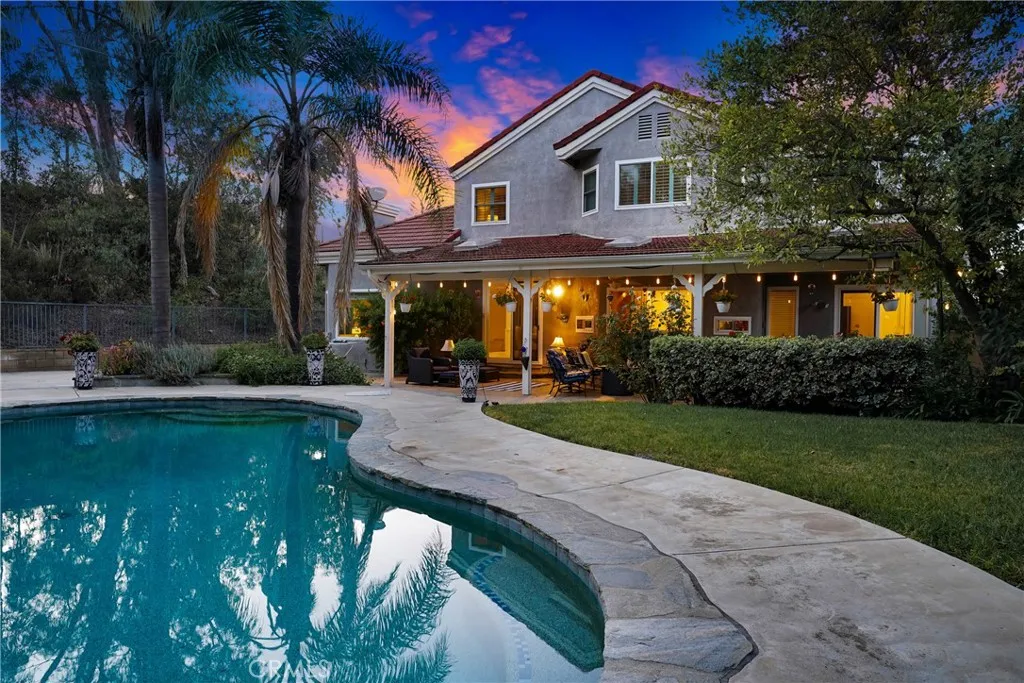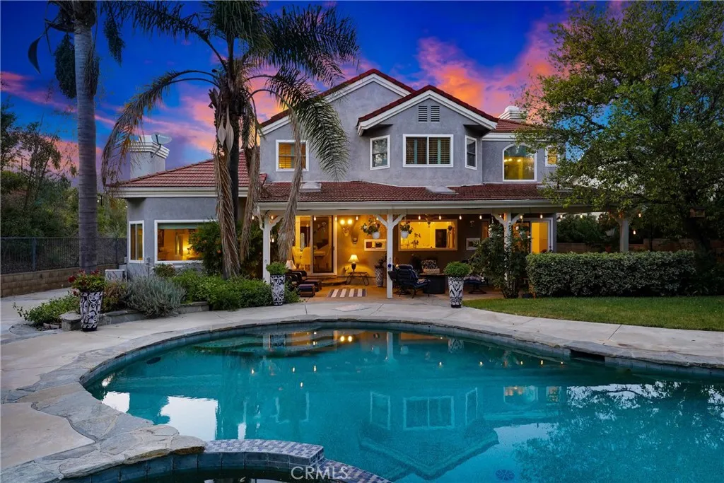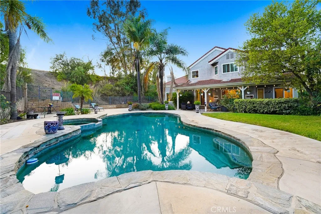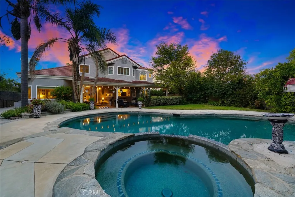 Nestled in the highly sought-after Buttercreek Estates community is a stunning residence that blends luxury, privacy, and functionality. This expansive 5-bedroom, 4.5-bathroom home spans approximately 3,603 square feet and sits on a generous 10,460 sq ft lot at the end of a quiet cul-de-sac, bordered by open space on three sides with only one direct neighbor—offering a rare sense of seclusion and serenity. From the moment you enter through the grand double doors, you’re welcomed into a dramatic foyer featuring soaring ceilings, a graceful spiral staircase, and elegant tile flooring. The main level boasts a formal living room with a cozy fireplace, a private ensuite downstairs bedroom, a formal dining room with French doors, and an expansive family room with custom built-ins, recessed lighting, and a second fireplace. The chef’s kitchen is a true centerpiece, featuring granite countertops, a center island with breakfast bar, stainless steel appliances, custom cabinetry, and picturesque views of the backyard oasis. Upstairs, the luxurious primary suite offers a private retreat with a separate sitting area and a spa-inspired bathroom complete with dual vanities, soaking tub, custom cabinetry, and a massive shower equipped with seven shower heads. Three additional bedrooms upstairs provide ample space for family or guests. Outside, the resort-style backyard is an entertainer’s dream, featuring a 600 sq ft covered patio with skylights, ceiling fan, built-in BBQ, outdoor entertainment system, and a sparkling Pebble Tech pool and spa, all surrounded by lush landscaping and tranquil hillside views. Additional highlights include a 3-car garage with built-in storage and custom quiet-close doors, dual-pane windows throughout, and thoughtful upgrades that add style and comfort. Ideally located in a peaceful, established neighborhood with access to top-rated schools, parks, and local amenities, this home is the perfect blend of upscale living and everyday convenience.
