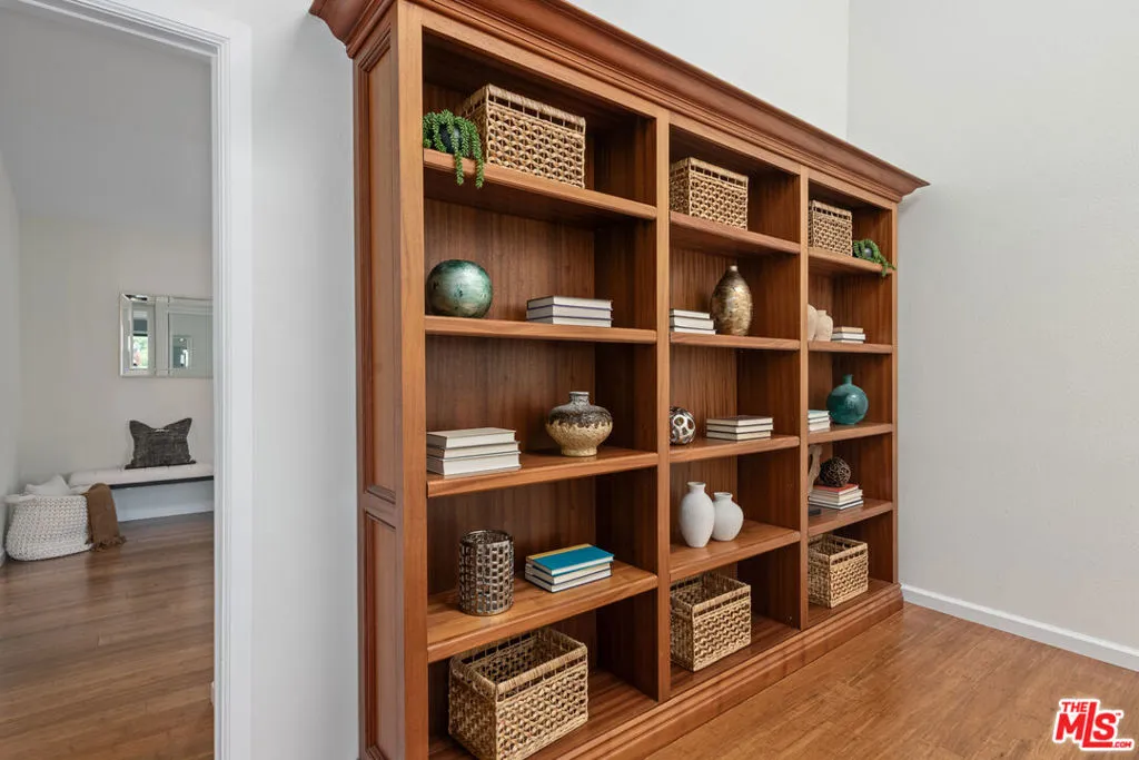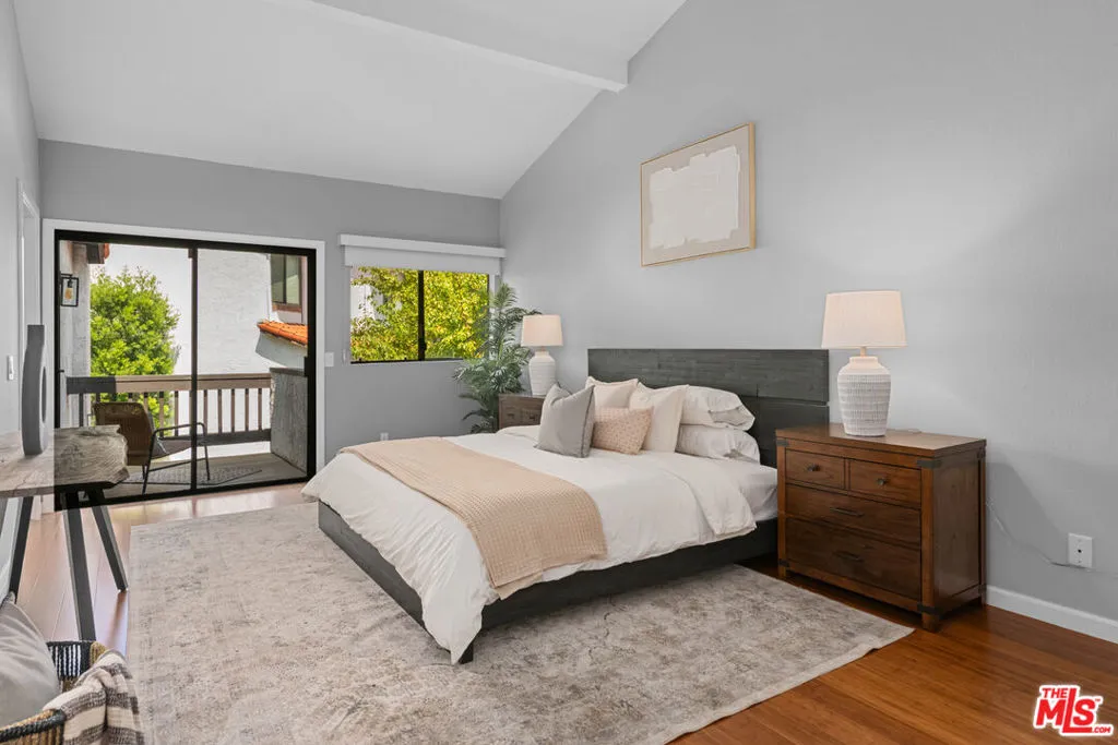 Step into this beautifully designed home featuring an inviting open floor plan that seamlessly integrates the living room with high ceilings, a striking rock stone fireplace, bamboo flooring and an al fresco dining area perfect for entertaining. The spacious dining room boasts elegant glass railings and a stylish bar that leads to a gourmet kitchen, complete with dramatic mood lighting, stainless steel appliances, granite countertops, and custom “pull out” shelving cabinetry. Enjoy the convenience of a built-in microwave, a deep “D” sink, two wine chillers, cozy breakfast bar that are all seated on beautiful ceramic floors. The main level features an exclusive private office or 3rd bedroom that offers complete privacy from upstairs life. A central skylight bathes soft light onto the stunning upstairs mahogany bookcase then gently pours that light down through the glass railed stairwell to the dining area. The luxurious primary bedroom is a true retreat, equipped with a thoughtful designed custom walk-in closet and private balcony that provides relaxing garden greenbelt and mountain views. The master bath features double sinks and large spa tub that offer a serene escape. The second bedroom, also on the upper level, includes an updated bath providing comfort and style. Additional highlights of this freshly painted exceptional home include bamboo wood floors, tankless water heater, epoxy floor in the garage and comprehensive security system. The outdoor space is equally impressive featuring a spacious entertainers patio with privacy hedging perfect for socializing with family and friends. Just up the path is a sparking swimming pool framed by a mountainous landscape featuring a spa, gym, and sauna for ultimate relaxation and recreation. Enjoy the security of a spacious 2 car garage with direct access and adjacent dedicated laundry area with ample cabinet space. There is additional utility in an under the home storage area access door. This residence also provides exclusive entry to a unique private park featuring dog-friendly zones, a playground, and expansive grassy areas, all located just minutes from the beach and picturesque local hiking paths that meander endlessly through the Santa Monica Mountains. Seize the chance to make this beautiful home yours! The fireplace is for decorative purposes only.