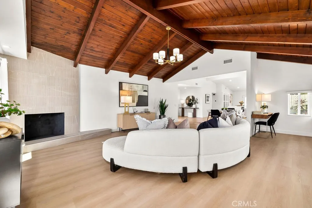 This is a beautifully remodeled single level home within proximity to beloved Huntington Beach. Enjoy entertaining in this warmly designed home. The remodeled galley-style kitchen with new and large pantry, nine-foot quartz island accommodating seating, opens to the dining and living rooms and has new French doors and all new stainless-steel appliances. Lofty ceilings extend to the dining room and to a richly accented wood Cathedral ceiling in the living room. Classy designer tiles truly highlight the fireplace. Of the three bedrooms, two have private three-quarter ensuite bathrooms. The third bedroom has access to the hall full bathroom. All bedrooms, within this great layout, are on one side of the home with kitchen, dining, and family rooms on the other.