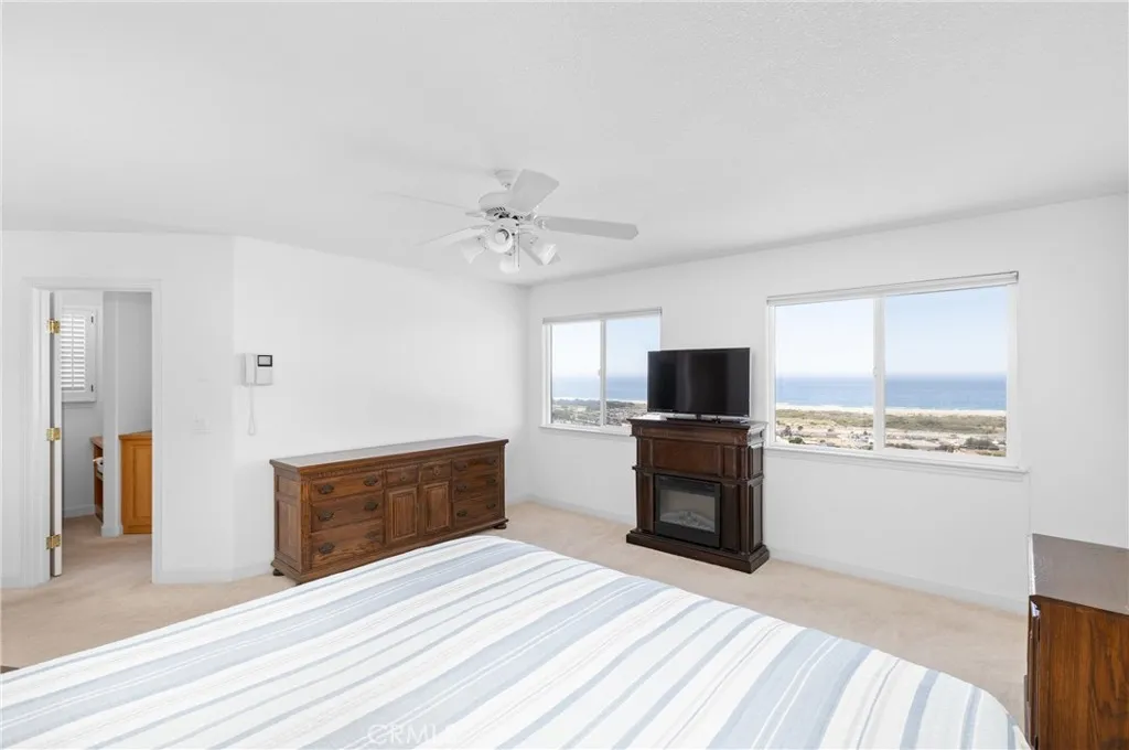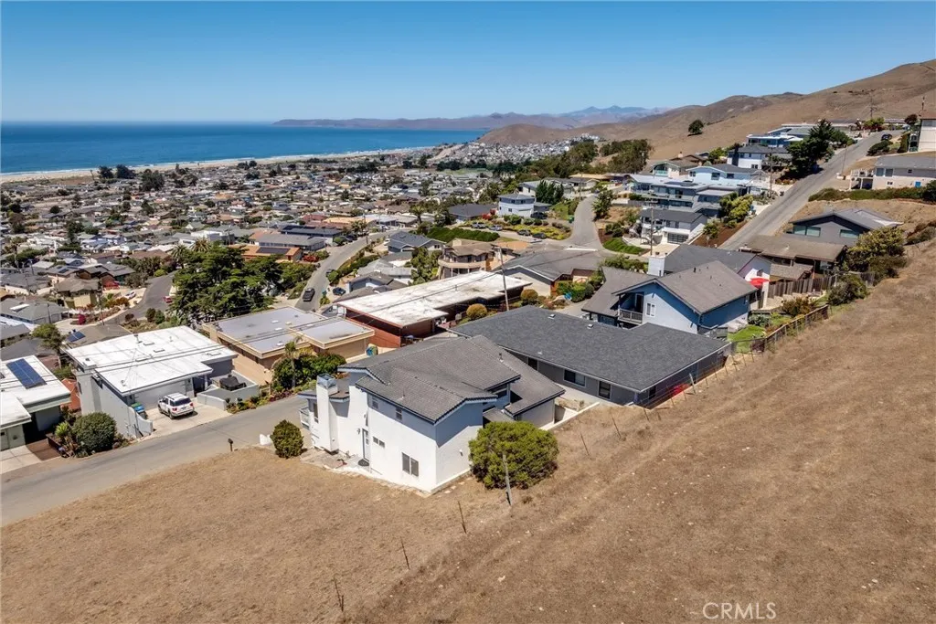 Spectacular panoramic ocean views stretch from Cayucos to Montana de Oro with peaceful ranch land behind—truly the best of both worlds. This 3-bed, 3-bath, 2,200 sq ft home boasts an open floor plan where the kitchen flows effortlessly into the living spaces, complete with a large prep island, tiled wrap-around breakfast bar, pantry, and ample cabinetry. The living room features a cozy fireplace, soaring ceilings with recessed lighting, corner windows framing iconic Morro Rock, and sliding doors leading to a view deck. Spacious enough to accommodate both casual lounging and a formal dining table, the living area is designed for entertaining. The primary suite lets you watch whales from bed, with a spa-like bath offering dual sinks, a soaking tub, and walk-in closet. A secondary en suite also captures ocean and Rock views, while the third bedroom is conveniently located near the third full bath. Extras include an oversized three-car garage, individual laundry with folding station, and low-maintenance stucco exterior—an ideal blend of comfort, design, and coastal lifestyle.