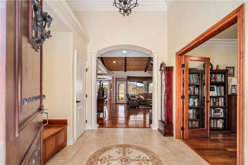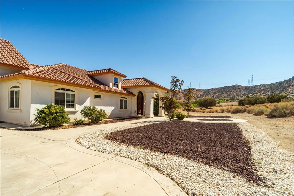 Situated on 9.87 acres, this Acton property showcases a double-stucco “Old World Style” exterior and a million-dollar view. A large covered patio provides the perfect setting for outdoor dining, entertaining, or simply enjoying the scenery. The attached 1170 sqft., 4-car garage is double insulated, offering added comfort and efficiency. The home is accessed through an impressive fiberglass front door, setting the tone for the quality craftsmanship found throughout the property.
