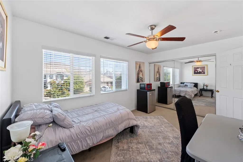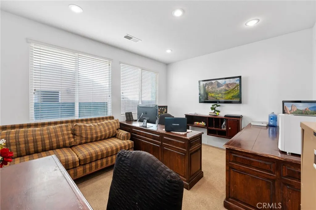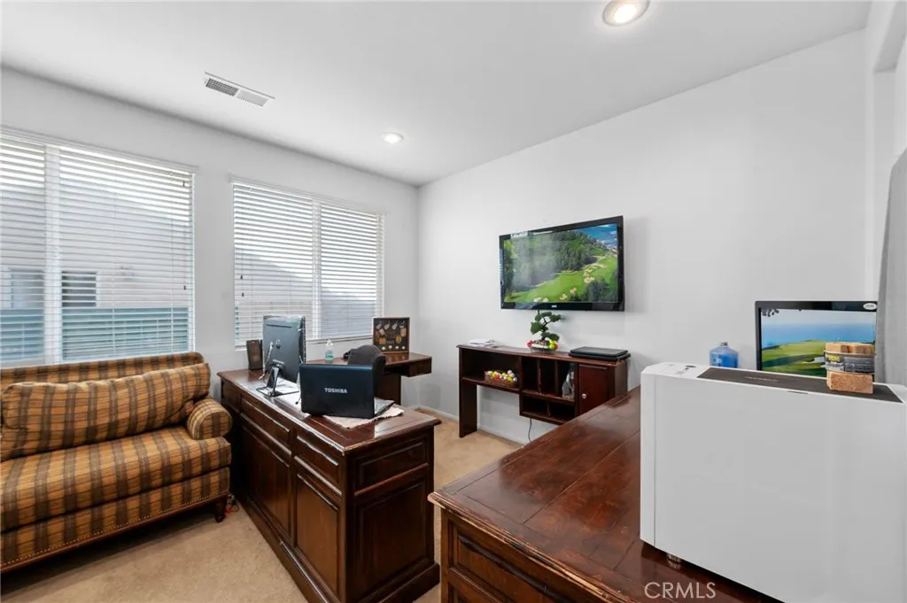 Welcome to your DREAM home with BREATH TAKING GOLF COURSE VIEWS in the prestigious Menifee Lakes area! This stunning 5-bedroom (Possible 6) , 4-bathroom, 2-story residence offers breathtaking views of the golf course and lake. With 2,916 square feet of living space, this home seamlessly blends luxury and comfort. The open-concept kitchen and living room are perfect for modern living and entertaining. The kitchen boasts ample counter space, a large island, and plenty of storage, making it a chef’s delight. Adjacent to the kitchen, the spacious living room provides a warm and inviting atmosphere, ideal for family gatherings and relaxation. The first floor includes a versatile office, 1 bedroom, 1 bathroom and a Den (possible 6th bedroom) providing plenty of space for work and leisure. The tandem portion of the 2-car attached garage has been thoughtfully converted into an additional room, offering even more flexibility for your needs. Upstairs, you’ll find the luxurious master suite and master bathroom featuring double sinks, a separate tub and shower, and a walk-in closet. Separate laundry room and 3 additional bedrooms which are generously sized, perfect for family or guests. Located just minutes from shopping centers, schools, and the freeway, this home offers both convenience and tranquility. Experience the best of Menifee Lakes living with this exceptional property. Don’t miss the opportunity to make this incredible home yours. Schedule a viewing today and envision your new life in the