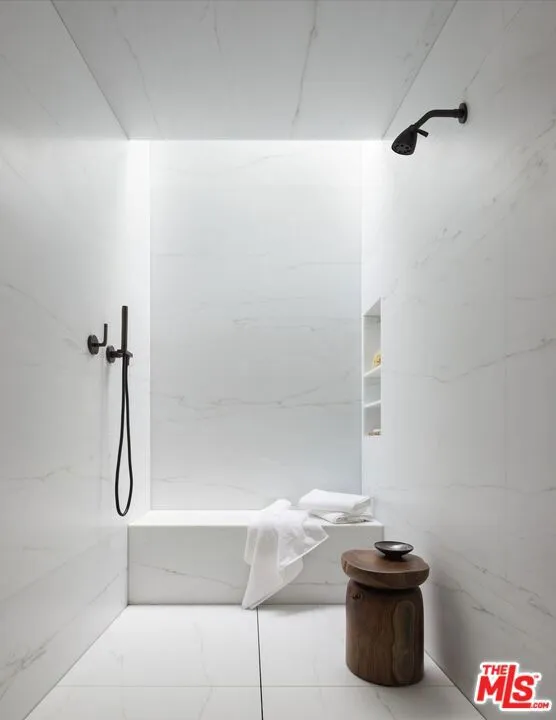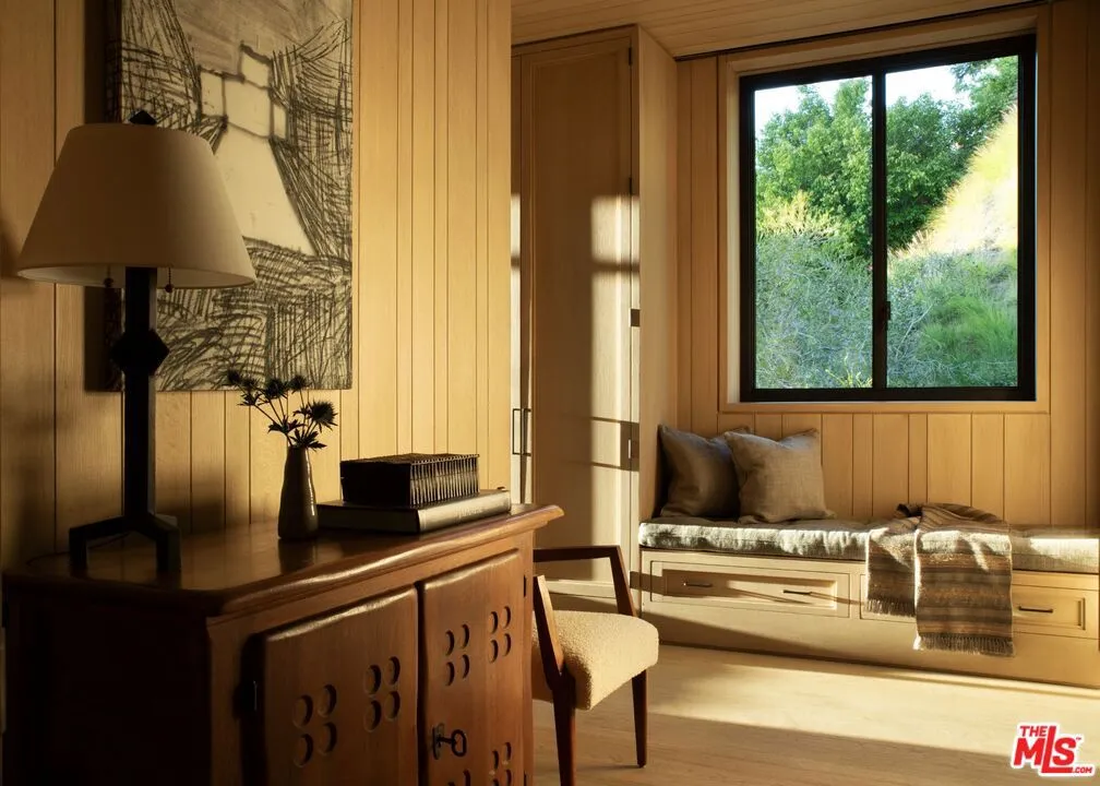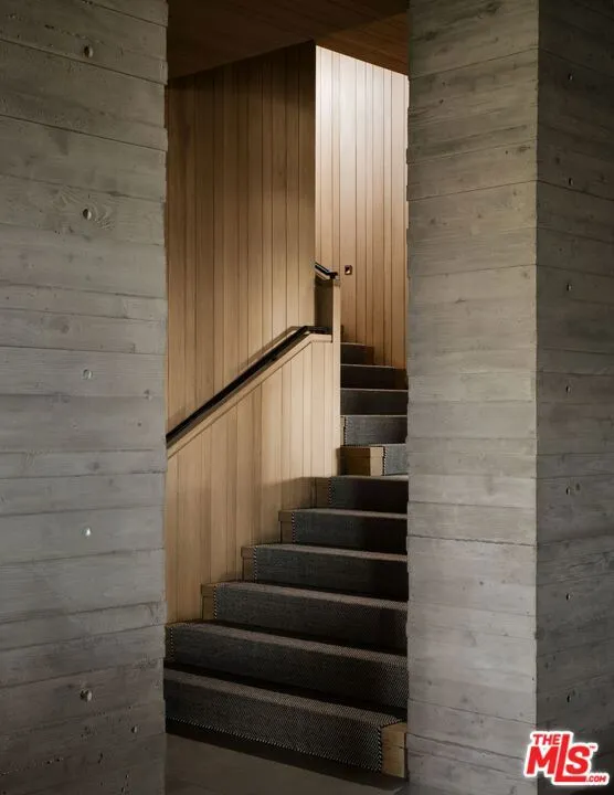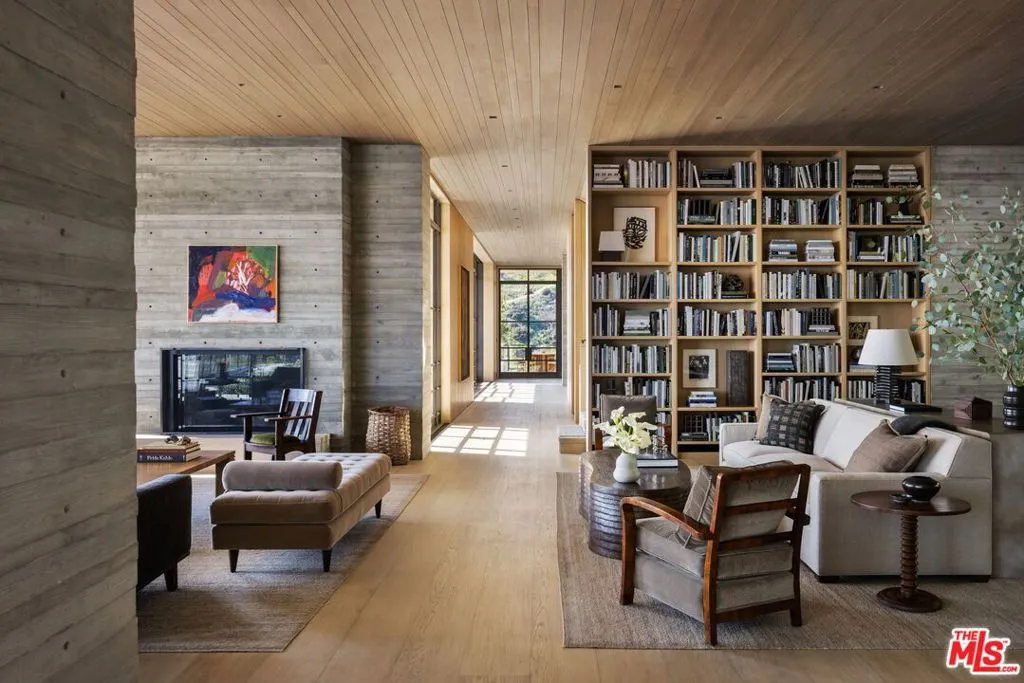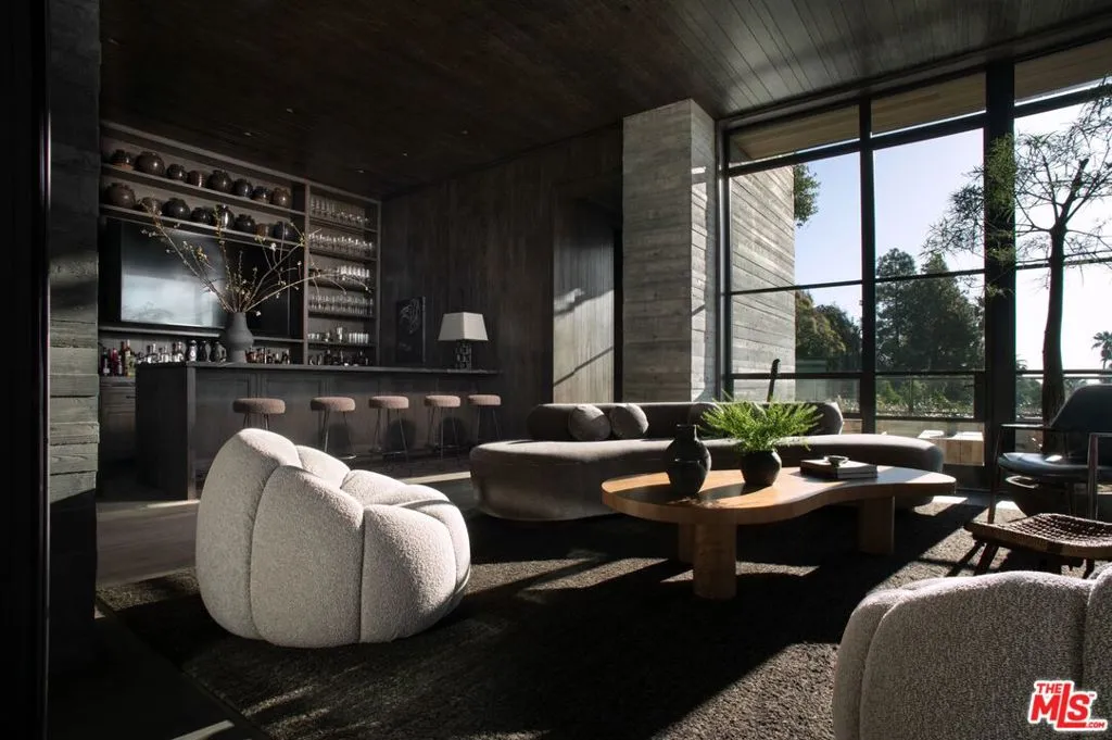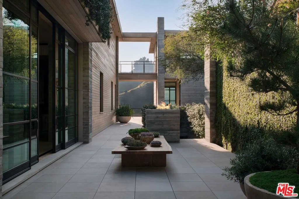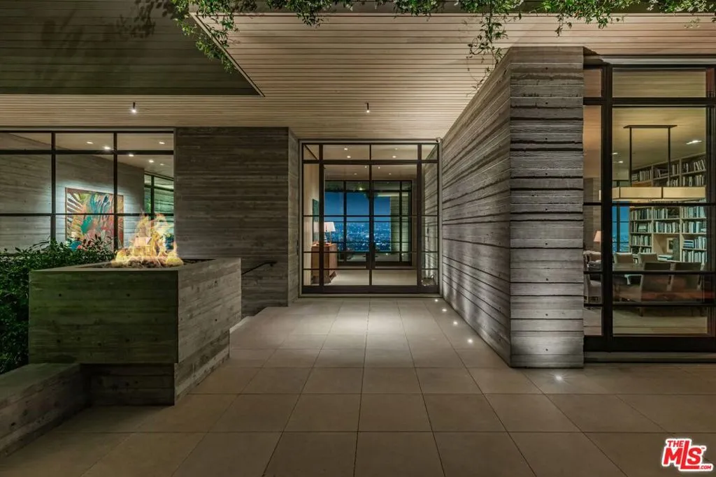 The Hollywood Hills House designed by Scott Mitchell Studio is a monumental and versatile modern villa rising out of the Hollywood Hills. The layered and terraced house – designed for living and entertaining – embraces views that span L.A.’s cityscape from east to west and out to the Pacific Ocean. This property is set on Los Angeles’s most iconic promontory that extends over one acre with no neighbors on either side and 270 views of the entire city. Set at the 50-yard line of legendary hot spots Chateau Marmont, Tower Bar, and the Hollywood Bowl, the energy of the city can be seen and felt from the estate’s peaceful privacy. Additionally, the property borders state land so no building can be constructed behind it, and it has private access to hiking in the famous Runyon Canyon. The form of the house follows a rigorous commitment to rich, organic materials and light. Grand outdoor decks provide seamless indoor and outdoor living. With expansive volumes over three floors, the tranquil and rooted hillside haven exudes a sense of balance, repose and a seamless connection to the natural landscape. A secluded driveway inclines to an impressive, cobbled motor court that can accommodate 12 or more cars and is nestled under the house with far-reaching views across the city. From there the villa’s grand and wide staircase begins, following the form of the building, passing a large-scale, vertical water feature to the landscaped north terrace and walkway, where native plantings and open fires frame the principal steel window and door entry system. On entering, to the east is a luxurious study and to the west, an open living room with fireplace and views across the city that flows into the dining room and on to the kitchen and family room, where floor to ceiling glass sliding doors open seamlessly connecting indoor and outdoor and framing wide urban vistas. On the exterior, wire-brushed narrow Itauba deck boards and an elegant dark stone clad infinity pool and hot tub are flanked by a sunken fire pit and seating area. A stand-alone pool bar and lounge is connected by a covered breezeway adjacent to an outdoor seating area. Walkways and terraces continue around the house incorporating native oaks and under-storied plantings that are composed with elements of fire and water. On the upper level, the primary bedroom wing comprises not only the primary bedroom but separate bathrooms and dressing rooms, and a study that can be isolated from the rest of the suite by a discreet pocket door system. On the lower level is a recreational zone with state-of-the-art screening room, billiards room with lounge area, and a bar. These program elements are organized around a gracious distribution foyer which doubles as a secondary point of entry to the house and leads to the motor court, which can be converted into a conditioned, modern ballroom. The house was built over a 10-year period, and new codes have been created since its construction, preventing a home of this type ever being built again in the Hollywood Hills. The house is constructed with $30 million of solid poured-in-place board-formed concrete with three feet thick concrete walls, and over 100 caissons that go 100 feet deep. The hard cost of the construction is $3,500 a square foot not including the land. The project engaged JRC Group, Inc., arguably the best builder in the city. The house includes a multi-million-dollar Jada steel door package, custom millwork, and audio/visual.