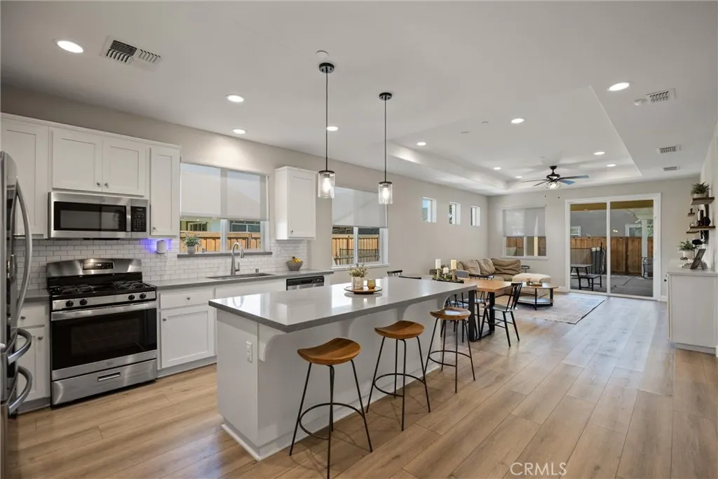 Inside, you’ll find an inviting open-concept floor plan that connects the kitchen, dining, and living areas. The kitchen shines with granite countertops, an island with seating, and Energy Star-rated appliances—perfect for daily meals or gatherings. Natural light and tasteful finishes throughout add warmth and modern elegance. The bathrooms feature stone counters and contemporary fixtures, complementing the home’s clean design.