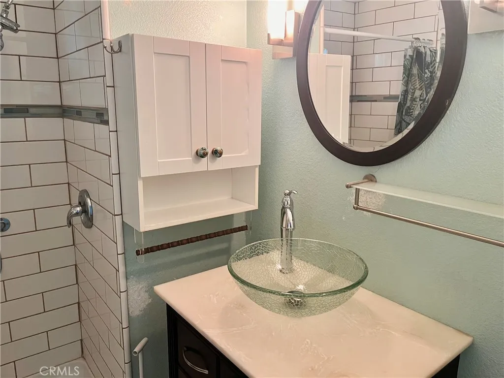 The bathroom has been tastefully updated with a stylish vessel sink, a contemporary vanity, and a luxurious walk-in tile shower complemented by chic tile flooring. This space is designed for both functionality and relaxation.