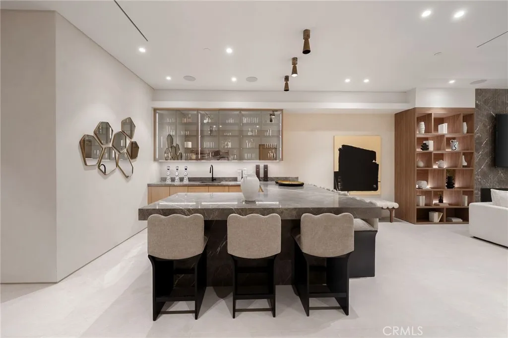 Set behind a canopy of mature olive trees that lend both shade and privacy, this newly built architectural residence spans approximately 7,700 square feet across two levels and a full basement. The main level unfolds with dramatic scale, offering expansive living, dining, and family rooms anchored by a sleek fireplace and framed by soaring floor-to-ceiling windows that flood the interiors with natural light. A flexible office or guest suite with an adjoining three-quarter bath enhances the layout. The gourmet kitchen is a statement in design, appointed with bespoke DOCA cabinetry, quartz countertops, a professional 6-burner cooktop with hood, Miele double ovens, wine refrigerator, beverage center, microwave, and a generous sized pantry. Upstairs, three spacious en-suite bedrooms include a tranquil primary suite featuring a fireplace, private balcony, custom oversized closet, dual sinks, freestanding soaking tub, and a luxurious rain shower. A serene hallway patio and a second laundry room add both style and convenience. The lower level is dedicated to leisure and wellness, boasting a state-of-the-art theater, fitness studio, wet bar, sauna, steam shower, bedroom with en-suite bath, custom built-ins, and a refined fireplace. Outdoors, the resort-style backyard is designed for entertaining with a sparkling pool and spa, barbecue island, mini-fridge, and a two-car garage. A private junior ADU suite offers further versatility with a kitchenette, stacked washer/dryer, three-quarter bath, balcony, and dramatic floor-to-ceiling windows. Additional highlights include wide-plank hardwood and stone flooring throughout, elevator access to all levels, and a fully integrated Crestron smart home system. Located on one of Santa Monica’s most desirable streets, just moments from Palisades Park, the beach, fine dining, and luxury shopping.