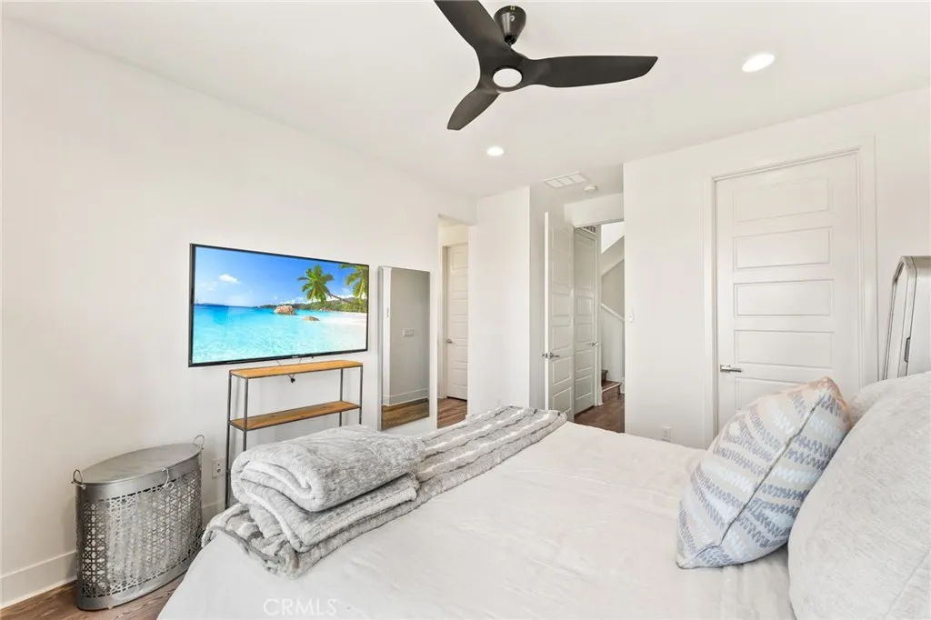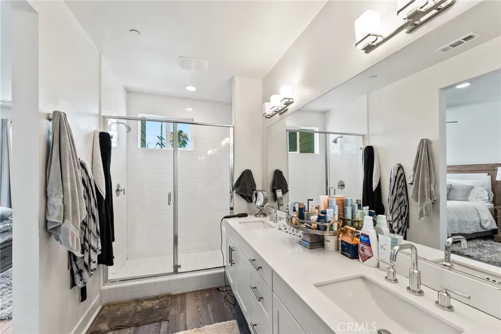 Upstairs, the third level features two guest bedrooms that share a full bathroom, along with the primary suite. The primary offers a spa-like retreat with dual sinks and a walk-in shower. As an added bonus, the home includes a rooftop deck — the ultimate space to relax, host gatherings, and enjoy the Southern California lifestyle.