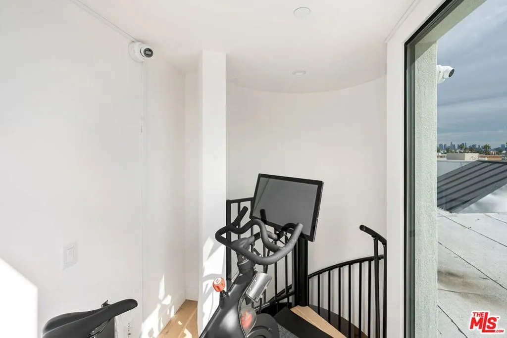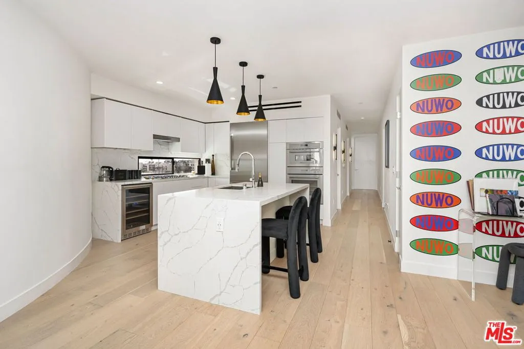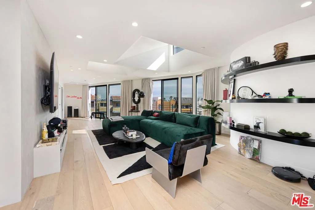 Penthouse perfection. This architecturally distinguished residence crowns the building and commands sweeping city and hillside views. A private elevator opens directly into the home, creating an immediate sense of discretion and arrival. A sculptural spiral staircase leads to an expansive rooftop deck reserved for this residence alone, an ideal setting for quiet mornings and evening entertaining under the skyline.Designed by Wil Carson, the interiors blend graceful curves with warm contemporary finishes. European oak floors ground an open living and dining area that flows into a chef kitchen appointed with Calacatta Laza quartz counters and a waterfall island, Thermador appliances, custom white cabinetry, and a wine cooler.The flexible three bedroom plan is currently configured as two bedrooms plus a custom dressing room with extensive closet space and the third bedroom can be restored with ease. The serene primary suite offers generous wardrobes and a well appointed bath. Additional conveniences include in unit washer and dryer, mobile controlled security, and keyless entry for both the front door and the elevator.The building provides true privacy with controlled access that requires a fob for each floor and gated subterranean parking for two cars. From sunrise to sunset the penthouse frames remarkable views and delivers an elevated lifestyle moments from the Sunset Strip.