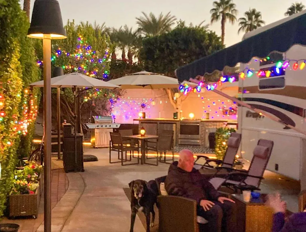Enjoy your own private RV oasis, perfectly located across from the pool, hot tub, and laundry. Ownership at Outdoor Resort Indio includes access to all resort amenities — golf, tennis, pickleball, fitness center, clubhouse, and more — all within a gated, luxury RV community.This beautifully landscaped perimeter lot offers privacy and thoughtful upgrades designed for comfort and functionality. Enjoy landscaping with a grapefruit tree and separate irrigation for pots. Entertain or relax with ease using the mobile, movable kitchen — complete with a custom steel walking platform — that can be set up in three different locations depending on your needs. Additional features include a water softener, perimeter lighting for evening ambiance, and a spacious layout ideal for hosting guests or simply enjoying your own retreat. This is RV living at its finest. Water softener is included.Outdoor Resort Indio is a gated Class A RV community. Only Class A RVs.