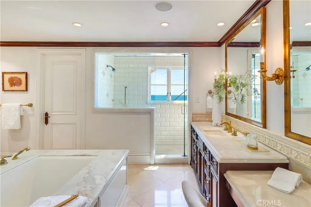 Crafted for elevated coastal living, the home includes formal living and dining rooms, a chef’s kitchen connected to a relaxed family and dining area, and two private offices. The primary suite is an exceptional retreat with a spa-inspired bath, oversized walk-in shower, soaking tub, and dual walk-in closets.