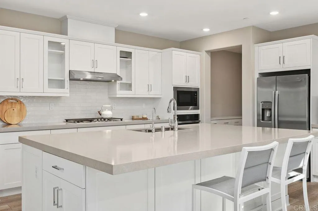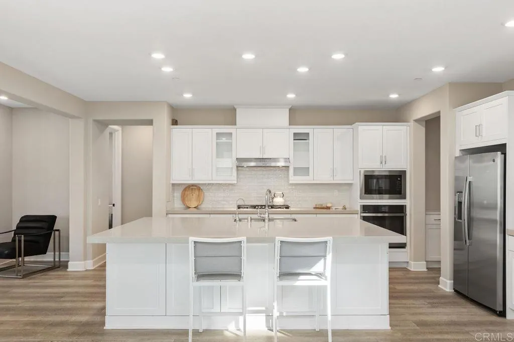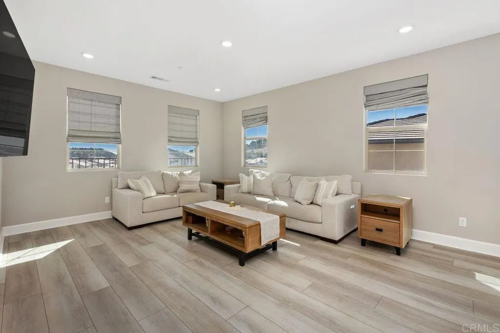 Welcome home to this one of a kind custom home with paid for solar in the beautiful neighborhood of Skylark! This elegant home has 2 primary suites-one upstairs, and one downstairs. The upstairs primary is a luxurious, peaceful retreat with a large walk in closet, a sitting nook for reading, a spa like bathroom with dual vanities, large walk in shower and a soaking tub. The open concept home boasts custom recessed lighting throughout, dual thermostats, a whole house water filtration system, a gourmet kitchen with large walk in pantry and plenty of storage everywhere you look! Directly off the foyer, is a private office with ample natural lighting that feels bright and fresh giving you the perfect place to work from home! The loft/bonus room upstairs is a great spot for kids, teens or multi-generational living, giving you that extra space for quality time movie nights with your family. Outside, the large sliding glass door opens the way for an enormous covered patio, giving you the indoor/outdoor living that everyone in Southern California is looking for! Picture outdoor meals with your family on cool fall nights, with the built in BBQ conveniently located right outside, and the fire pit lounge ready for smores after dinner! With no neighbors behind you, the fire and water feature outside completes the peaceful, relaxing evening retreat you are looking for at the end of the day! Finally, the 3 car garage features an epoxy coating, a tankless water heater, loads of storage areas, and an EV car charger!