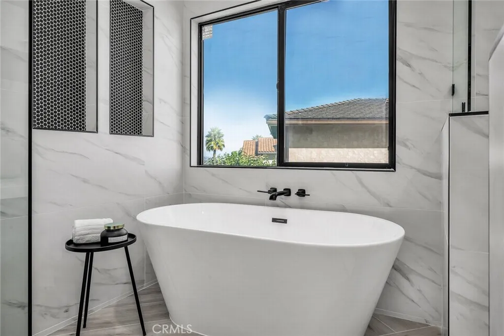 The primary suite offers a spacious retreat, complete with an enormous closet with built-in storage. All bathrooms have been meticulously remodeled with high-end finishes, and the home also boasts a beautifully remodeled chimney. Outside, the backyard offers breathtaking views of the Palos Verdes Hill, providing the perfect setting for relaxation or entertaining guests.