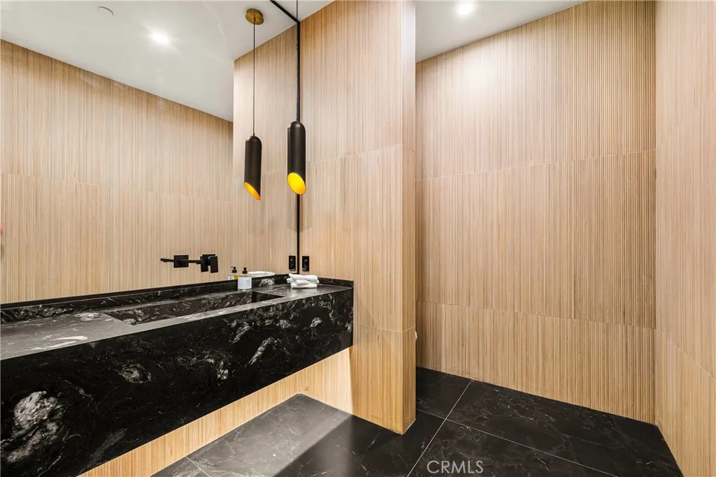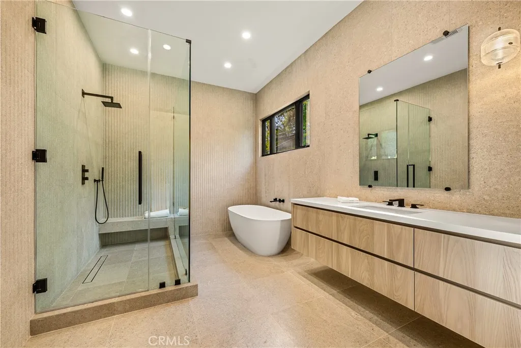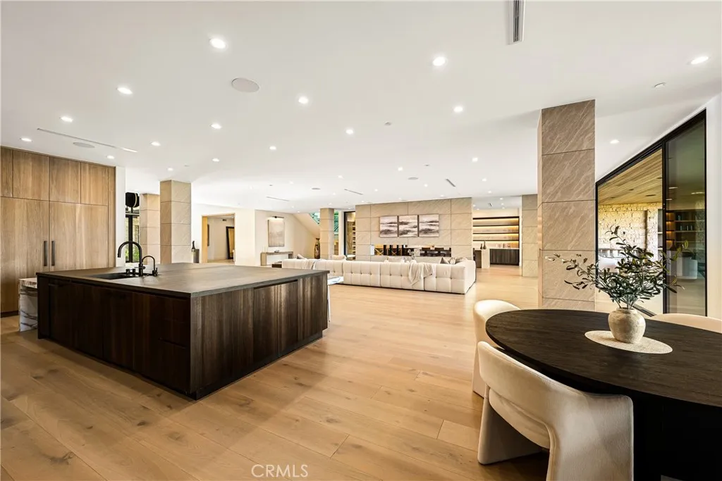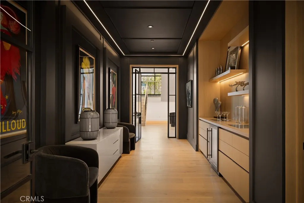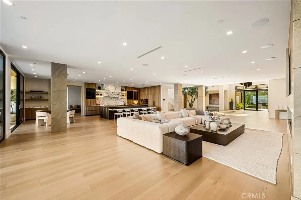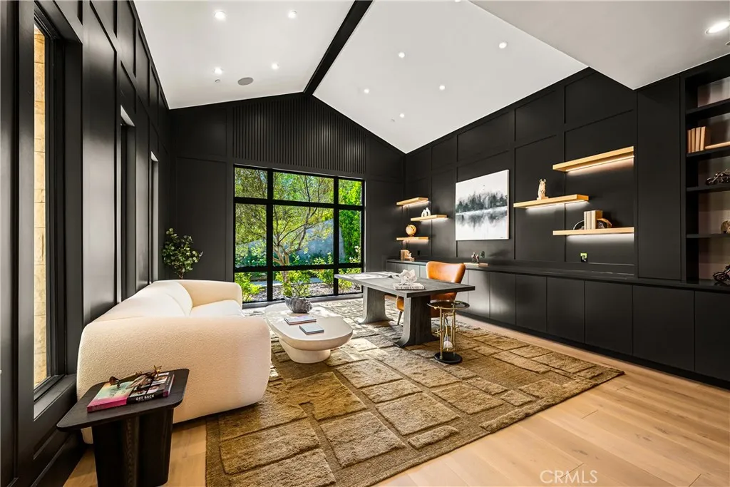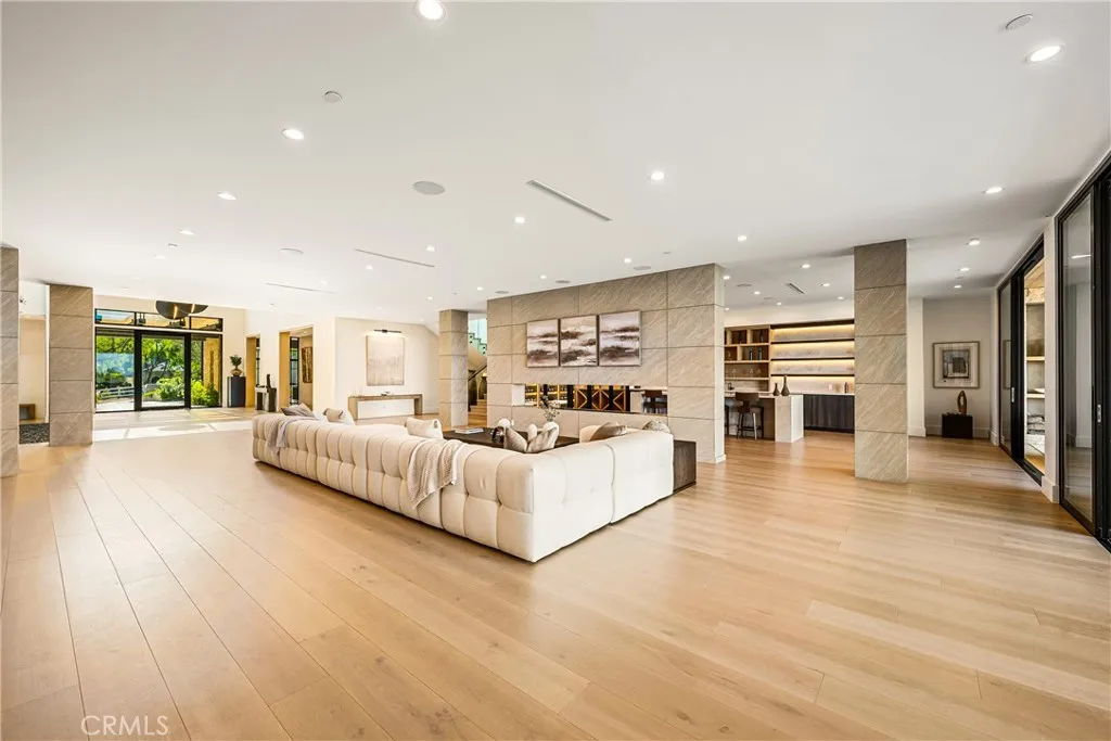 Perched on a pristine 1.6-acre lot in the prestigious Ashley Ridge enclave of Hidden Hills, this newly constructed estate is a masterpiece of modern luxury and design. From the moment you step through the custom front door, you’re welcomed into a world of refined elegance. A breathtaking two-story foyer crowned by a full glass ceiling floods the interior with natural light, setting the stage for the home’s extraordinary ambiance. The expansive open floor plan is designed for both grand entertaining and effortless daily living. At its heart is a chef’s dream kitchen featuring a large center island with counter seating, a spacious breakfast area, and an adjoining butler’s pantry equipped with a separate catering kitchen. The kitchen flows seamlessly into a spectacular great room with sliding glass walls, a two-sided fireplace, and an adjacent living lounge complete with a stylish seating bar and a glass-enclosed, temperature-controlled wine display. Additional highlights include a formal dining room, a sunlit private office with picture windows, a state-of-the-art home theater with acoustic fabric walls, a large game room, and an oversized gym and spa area featuring a steam shower and sauna. Upstairs, a dramatic vaulted den with open-beam ceilings and a full wall of glass overlooks the beautifully landscaped grounds. With six generous en suite bedrooms—two on the main level and four upstairs—this home offers both comfort and privacy. The opulent primary suite is a true sanctuary, complete with a fireplace, two luxurious bathrooms (each with a soaking tub), custom walk-in dressing rooms, and a private balcony showcasing sweeping views of the city lights and rolling hills. The resort-style backyard is equally impressive, featuring a stunning zero-edge infinity pool and spa, over 2,000 square feet of covered outdoor living space with a fireplace and full barbecue kitchen, and expansive lawn areas perfect for recreation or entertaining. This trophy estate delivers a rare blend of architectural brilliance, top-tier amenities, and an unbeatable location on one of Hidden Hills’ most coveted streets.
