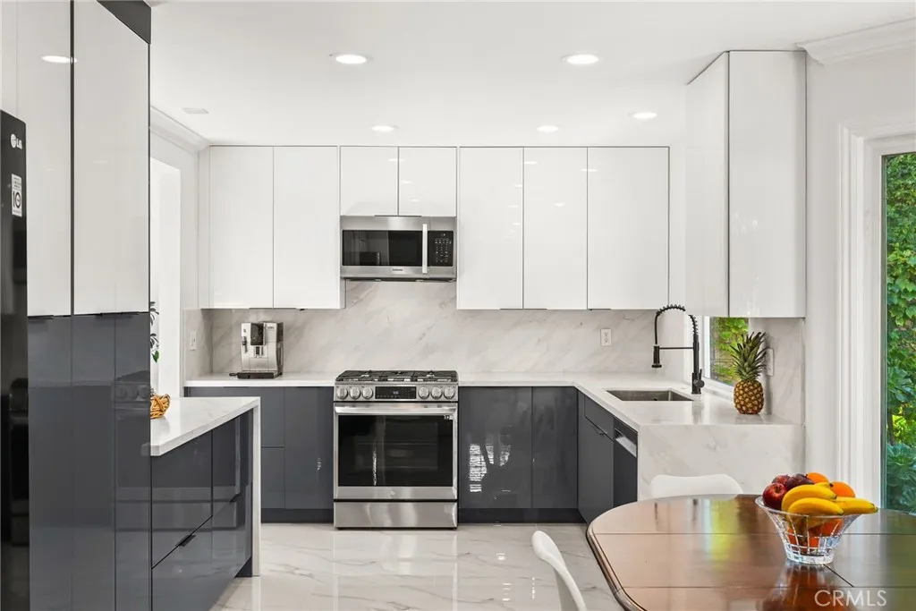 Inside, soaring ceilings and mahogany floors set an elegant tone. The open kitchen boasts European-style cabinetry, marble porcelain tile, and new lighting, while the bathrooms have been stylishly updated. Upgraded Milgard windows, QuietCool fans, and a recently updated A/C system ensure year-round comfort.