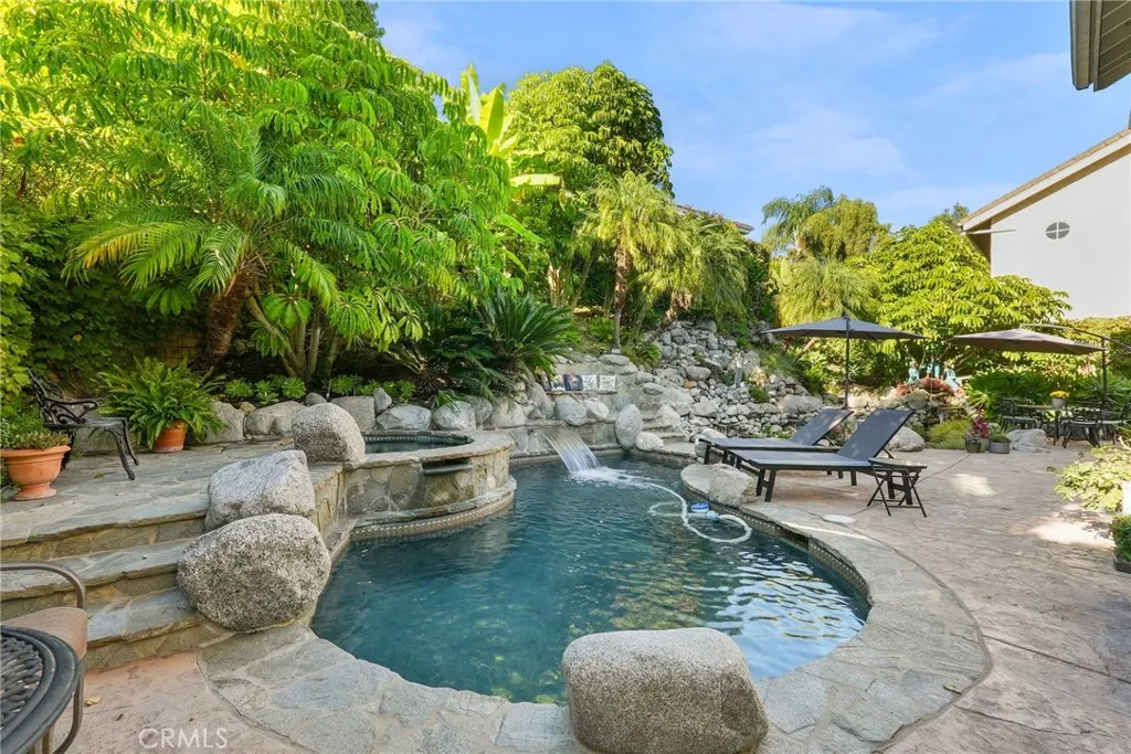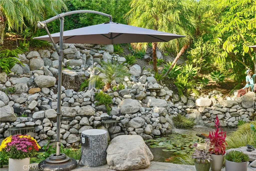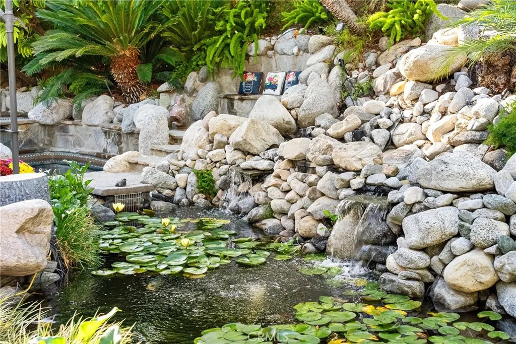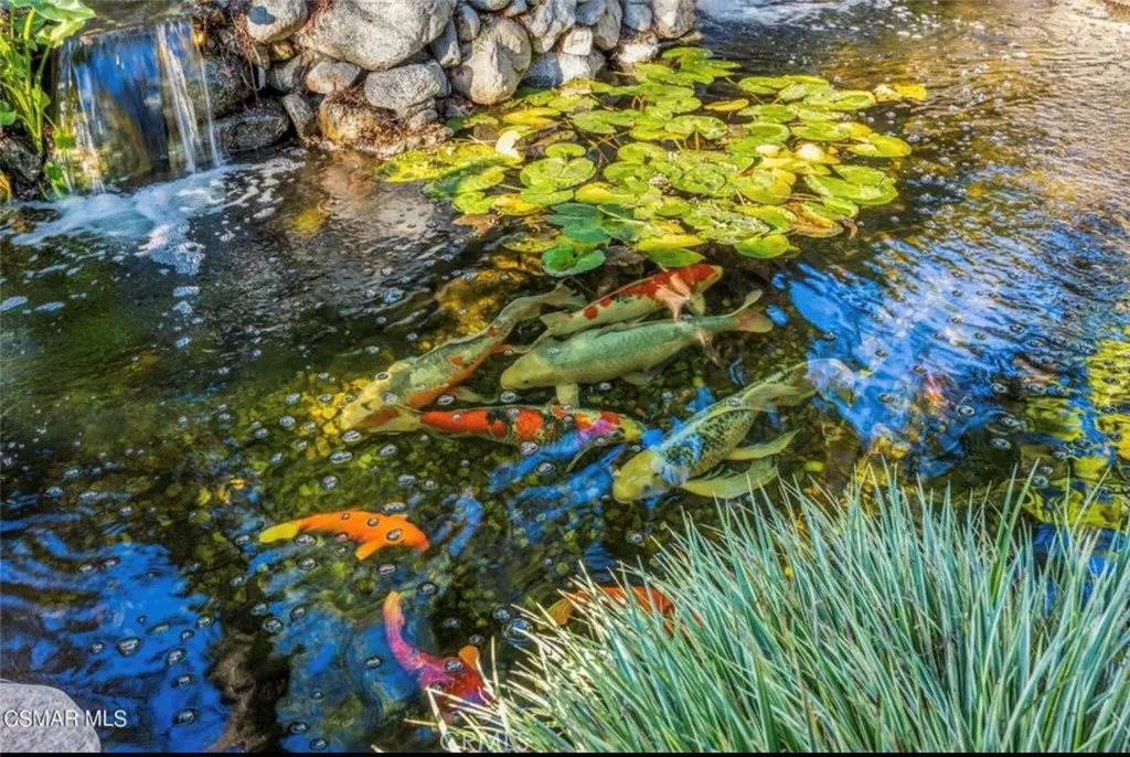 This serene property features lush landscaping, mature trees, a sparkling pebble-tech pool/spa, built-in BBQ with outdoor fridge, and a tranquil koi pond with a lighted waterfall. A new bi-fold patio door creates seamless indoor/outdoor living.