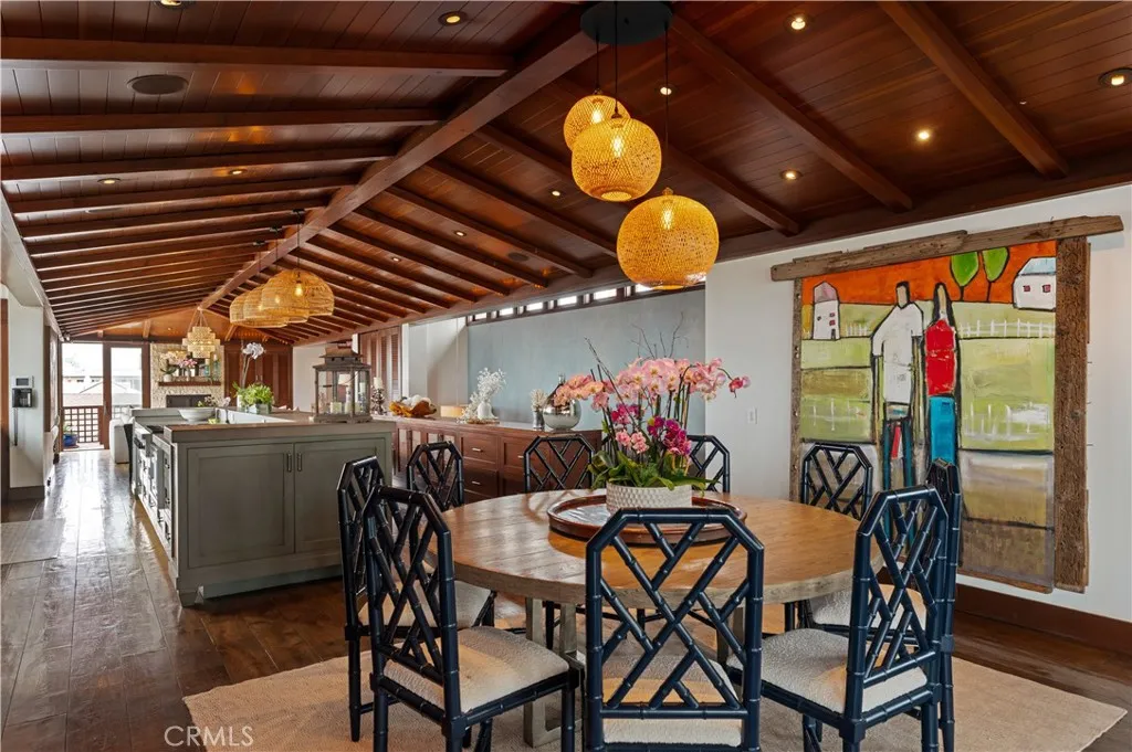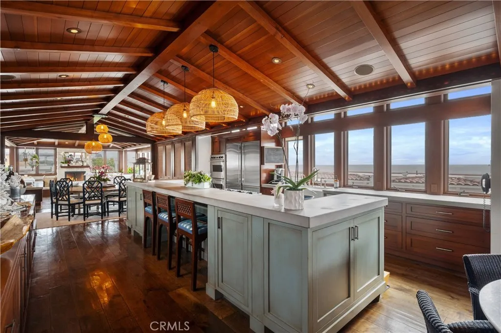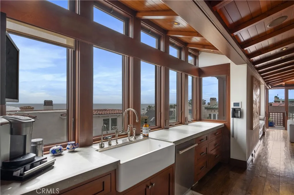 Welcome to 126 4th Street, a stunning coastal retreat in the heart of Manhattan Beach. Crafted by KAA award-winning architects and interiors by Waterleaf, this beautifully designed multi-level home combines modern elegance with beachside charm, offering breathtaking ocean views and luxurious amenities. This expansive 6,000 sq ft property features 4 bedrooms, 6 bathrooms, and a modern tropical design that evokes the feeling of a perpetual vacation. The welcoming front entrance leads to an outdoor patio perfect for entertaining, featuring comfortable seating around a cozy fire pit. The spacious living room boasts large windows with ocean views, a charming fireplace, and elegant furnishings. The gourmet kitchen includes high-end appliances, a gas cooktop island, and custom cabinetry, seamlessly connecting to a comfortable family room and dining area, perfect for family meals and entertaining guests. Multiple balconies provide stunning views of the ocean and the surrounding neighborhood, creating ideal spots for relaxation. The primary suite offers a private sanctuary with dual vanities, and a walk-in shower. Additional well-appointed bedrooms are spacious and tastefully decorated, offering plenty of natural light and comfortable living spaces. The oversized media room is perfect for watching movies, playing games, and is great for kids, teens, and sleepovers. The home gym is equipped with a Peloton and Infra Red Sauna, and additional features include a dedicated office space, a spacious laundry room, and an outdoor shower area perfect for rinsing off after a day at the beach. The 2-car garage provides extra space for bikes, paddle boards, surfboards, beach chairs, and more, along with an electric car charging station. Enjoy the beach bar with a kegerator and a small kitchen, ideal for watching sports and hosting gatherings. With air conditioning and a cleaning crew twice per week, this home ensures a lifestyle of luxury and convenience. Located just steps from the beach, 126 4th Street offers easy access to the best that Manhattan Beach has to offer, including fine dining, shopping, and recreational activities. Experience the best of coastal living in this beautifully appointed home available for lease, where modern amenities blend perfectly with the charm of beachside living.