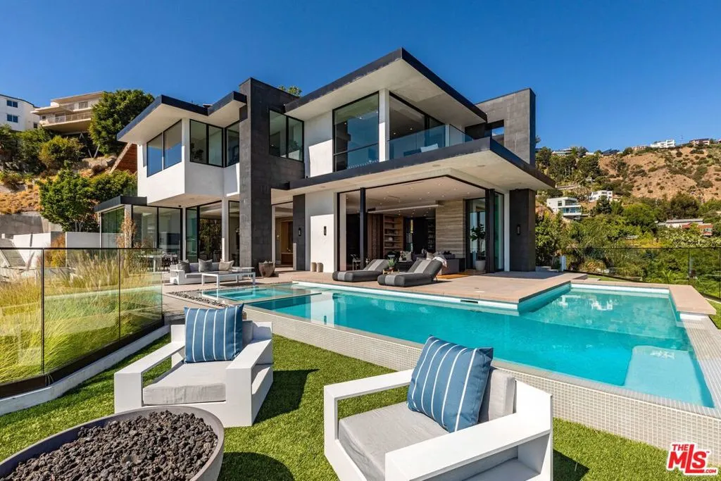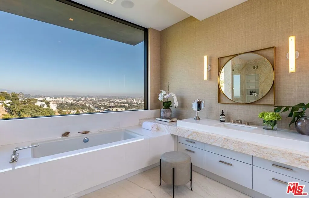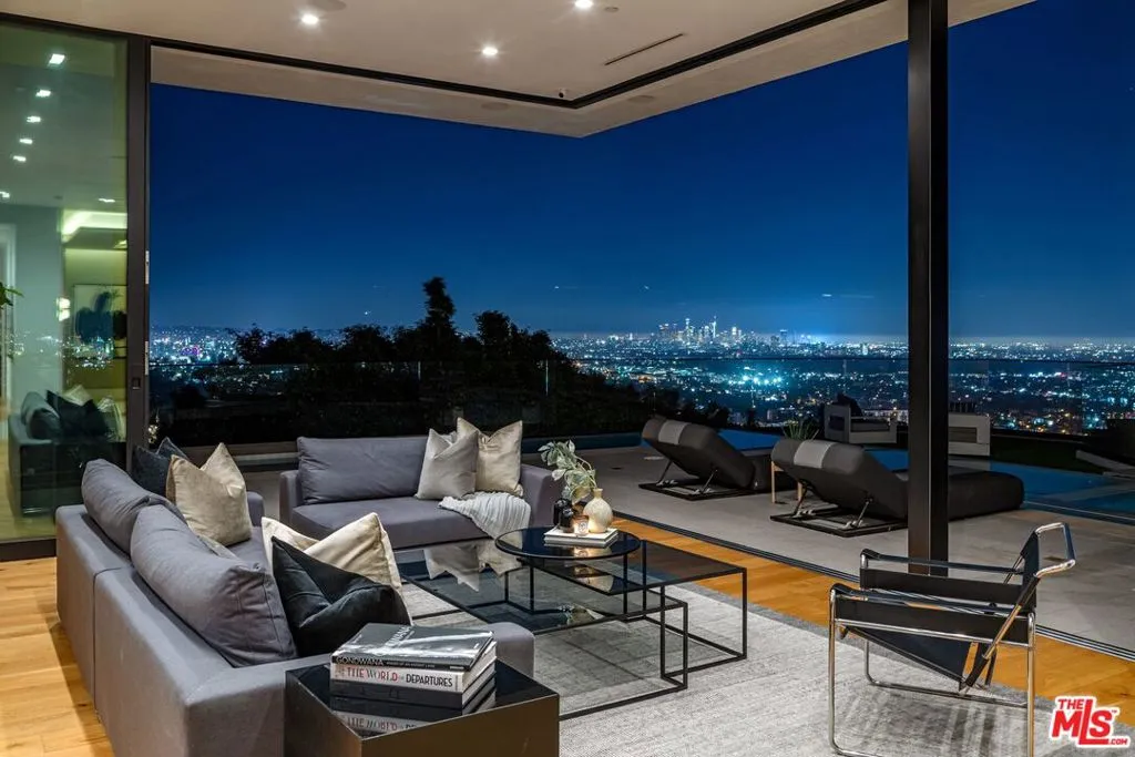 Quintessential Sunset Strip Modern with A+ views from downtown to the ocean! Walled and gated motor court, perfect for the high-profile privacy/security conscious. Double height entry. Versatile living rooms lead to vanishing walls of glass opening to wraparound outdoor space featuring an infinity-edge L pool, spa, firepit. Chefs eat-in kitchen with Gaggenau appliances, marble countertops, butler’s pantries & double island. The primary suite features a sitting room, dual bathrooms, dual walk-in closets, and an outdoor patio. Movie theater, video wall in entertainment room with bar opens out to the view and terrace. Gym or guest suite w/ wet/dry sauna. Off street parking & 3 car garage. Award winning designer Tim Campbell used midcentury modern influences like grand terrazzo, antique brass, warm woods and elegant natural stone. Moments from Sunset yet perched on a promontory.