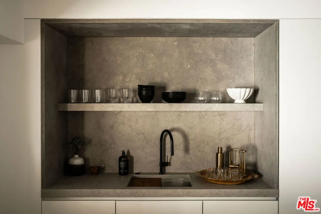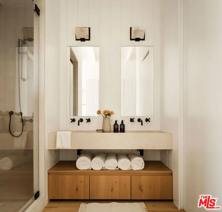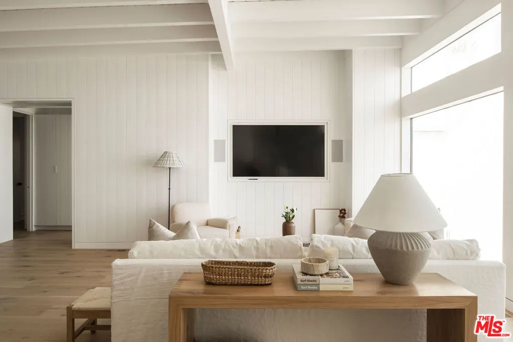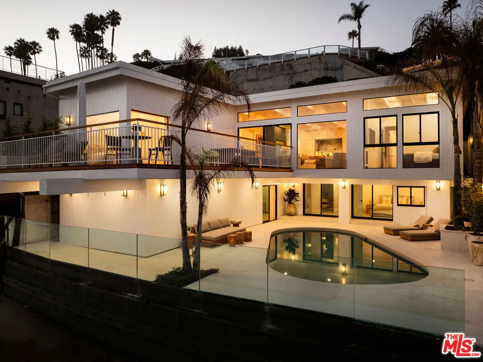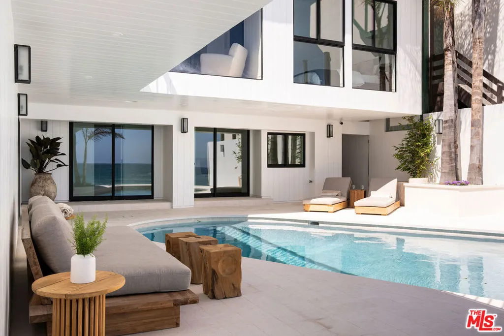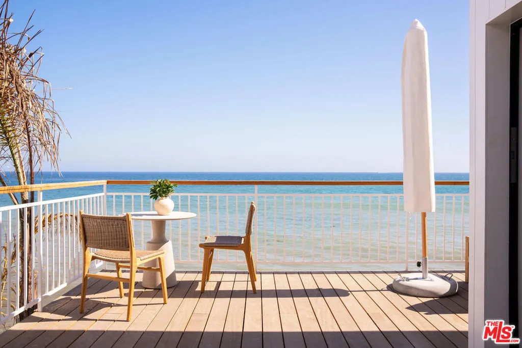 Situated off of PCH on the Private Escondido Beach Road, sits this Mid-Century gem on 50 feet of the exclusive and coveted Escondido Beach. Embrace the opportunity to call this special property home, that has been extensively and meticulously reimagined by design team Warren Garrett. The newly completed home elegantly blends timeless materials with modern amenities and exudes a restrained sophistication. The turnkey beachfront residence offers 4 bedrooms, 4.5 baths, two levels of expansive waterfront decks and features a gorgeous french grey plaster pool that takes center stage only a few steps from the sand. This idyllic beach house is conveniently located steps away from the iconic Geoffrey’s restaurant and a leisurely beachside stroll to Paradise Cove Beach Cafe. Located near the end of a private street, the peaceful retreat enjoys ample separation from Pacific Coast Highway. The clean design of the modest exterior facade is centered by an arched solid steel front door opening to panoramic ocean views framed with white oak floors and soaring exposed beam ceilings. An open gourmet kitchen showcases a grand Italian limestone island, exquisite stone shelving, a La Cornue range and new high end appliances. The main level features 3 bedrooms with spa-like en-suite bathrooms, while the lower level offers a 4th bedroom and full bathroom with breathtaking views of the pool and ocean beyond. A secondary bar and kitchen as well as a cozy interior lounge were designed to make this the perfect setting for pool and beachside entertaining. This home is furnished and is move-in ready with brand new furnishings from Jenni Kayne Home, experience the best of coastal living in this unique Malibu beachfront paradise.