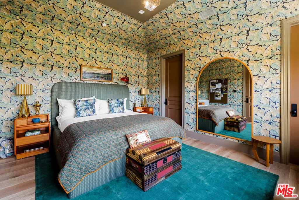 Perfectly situated in the coveted Pacific Palisades Riviera and set behind gates amidst lush and spectacular landscaping is this remarkable estate. The flawlessly executed interiors created by the renowned interior design firm Pierce and Ward, along with the home being a newly built Ken Ungar estate, make this home truly-one-of-a-kind. Every inch of the home, inside and outside, has been transformed to capture the striking canyon views and beams of light glowing through soaring windows and doors from sunrise to sunset at carefully designed vistas throughout the day. Enter through a stunning glass door to ultra-inviting living and dining rooms designed for daily enjoyment, with lavish yet welcoming interiors that appeal to all, featuring a London-chic flair mixed with mid-century design that will surely rival the best home designs executed in all of Los Angeles. The super-inviting family kitchen, with double banquet nooks you won’t want to leave all day, offers counter seating, a top-of-the-line Wolf range, multiple ovens, double sinks, and wall-to-wall refrigeration, all opening to a large, stunning family room reminiscent of a chic boutique hotel. This space seamlessly transitions to a large outdoor dining table and chef’s barbecue area, ideal for cooking and entertaining guests, all with stunning canyon views. The first floor also features a tucked-away office and a spacious downstairs suite, all carefully laid out with the architect’s clear understanding of a masterful floor plan. The second floor boasts a primary suite tucked in its own wing, with dual doors, a fireplace, two walk-in closets: one on each end, a luxurious bath suite, for two, with an oversized double shower, soaking tub, two water closets, separate sink areas, and make-up seating for her, all with beautiful views of the meticulously landscaped grounds and a balcony completing this truly intimate and cozy suite. Across the landing, the second floor also offers a cozy upstairs family room set between three suites, each designed with extraordinary interiors and beautiful tree-top views. An elevator services all three floors, including the lower level, which features the single most inviting screening room, clearly designed for family and friends’ movie nights. The lower floor also boasts a large open family room/pool and game room, a stunning bar area, and a wine room, all opening to a cozy patio with plenty of room to enjoy a cold plunge after Pilates in the custom-designed double studio suite and sauna. Down the hall, there is a jaw-dropping four-bed bunk room suite, perfect for late-night sleepovers or additional holiday guests. To complete this lush estate, there is an infinity-edge pool, oversized Baja shelves and spa, a built-in trellis with a fireplace, and a lower-level multiple seating area for guests, parties, and late-night conversations in this award-worthy landscape design encasing the entire estate. Simply exquisite and clearly one of Pierce and Ward’s finest design and landscape visions.
