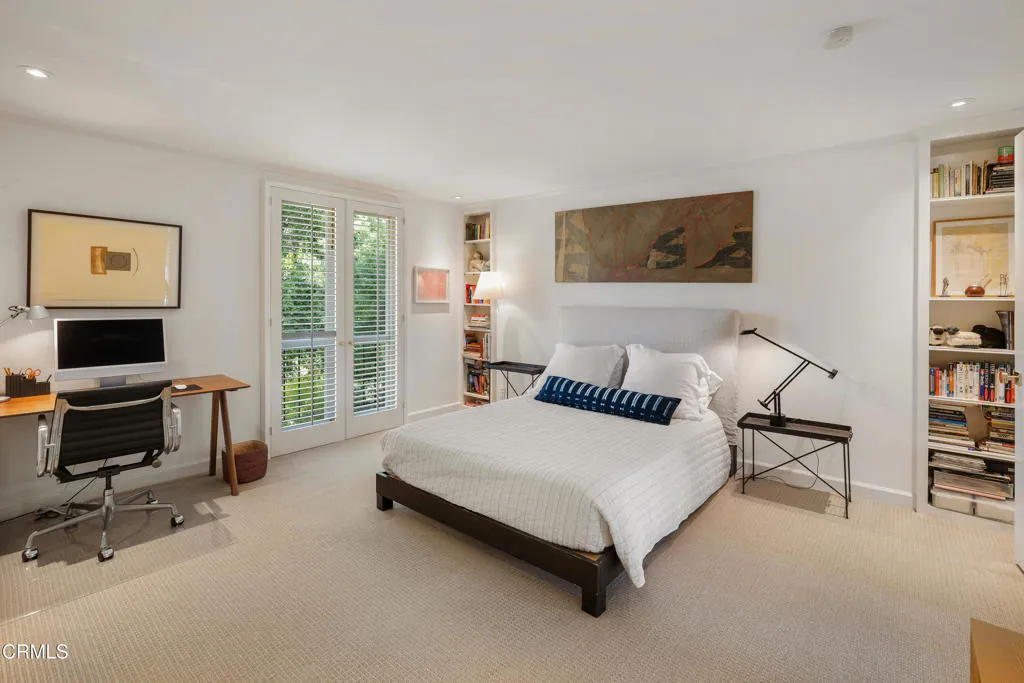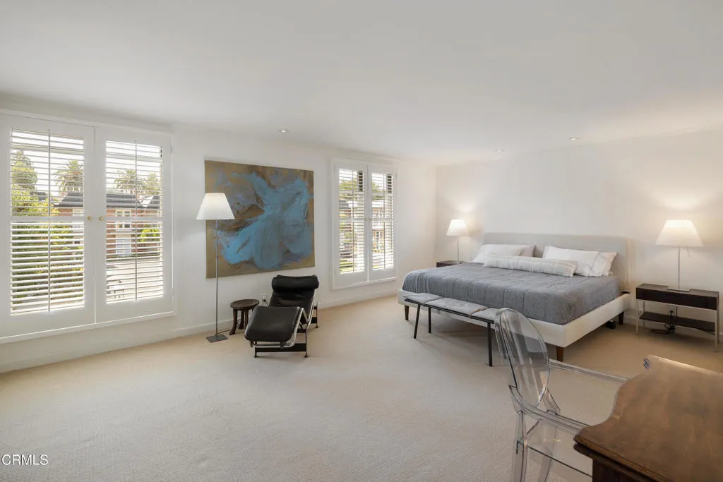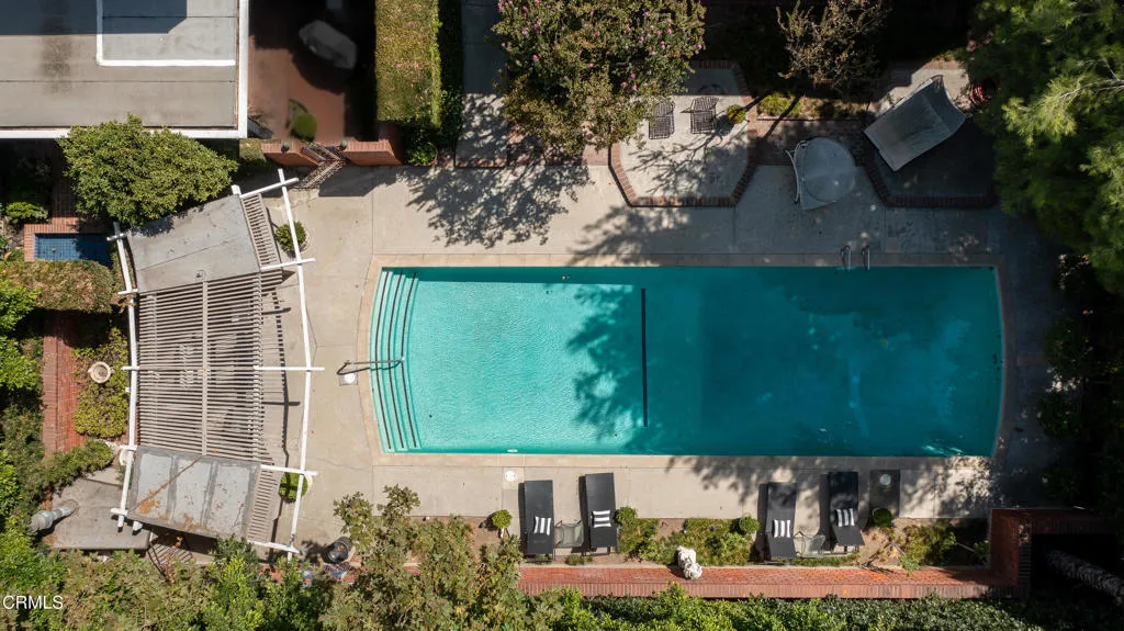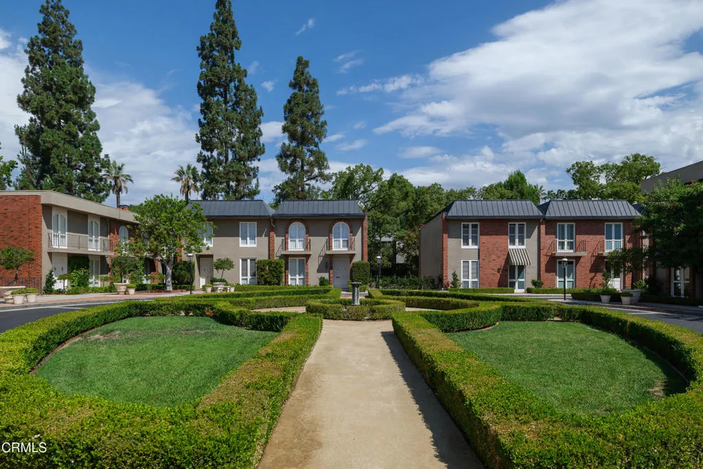 Sophisticated living within Pasadena’s desirable Craven’s Court along famed Millionaire’s Row, this exceptional end-unit residence boasts one of the most coveted floor plans in the enclave, offering both scale and privacy with only one shared wall. From the moment you arrive, the frosted glass double-door entry welcomes natural light into a refined interior where herringbone hardwood floors, recessed lighting, and thoughtful details set the tone. Just off the entry, a versatile bedroom or office space with a closet and an adjacent guest bath provides function and flexibility. The main level flows seamlessly with a stylish wet bar connecting to the gourmet galley kitchen, featuring stone countertops, custom tile backsplash, a Zephyr range hood, JennAir refrigerator, and the kitchen’s centerpiece, a Bertazzoni 5-burner cooktop and oven, regarded as the ‘Ferrari’ of ranges imported from Italy. A swinging door opens to the dining area, continuing into the spacious living room with crown molding, a fireplace, and direct access to a tranquil private patio with lush greenery and the soothing sound of a fountain. Upstairs, both bedrooms are private suites. The guest suite includes French doors with louvered shutters opening to dual balconies overlooking the patio, generous closet space, and a stone-topped vanity in the ensuite. Across the landing, the primary suite offers crown molding, custom built-ins, abundant closet space, and a spa-like bath with a stone vanity, a glass-enclosed shower, and luxurious finishes. Additional conveniences include a laundry closet, attic storage, and hidden retractable screens throughout. Residents of Craven’s Court enjoy a gated pool, lushly landscaped grounds, and a circular driveway that evokes timeless Pasadena elegance. This rare end-unit offers refined living along one of the most storied boulevards in Southern California, combining the feel of a private retreat with proximity to the heart of Pasadena!