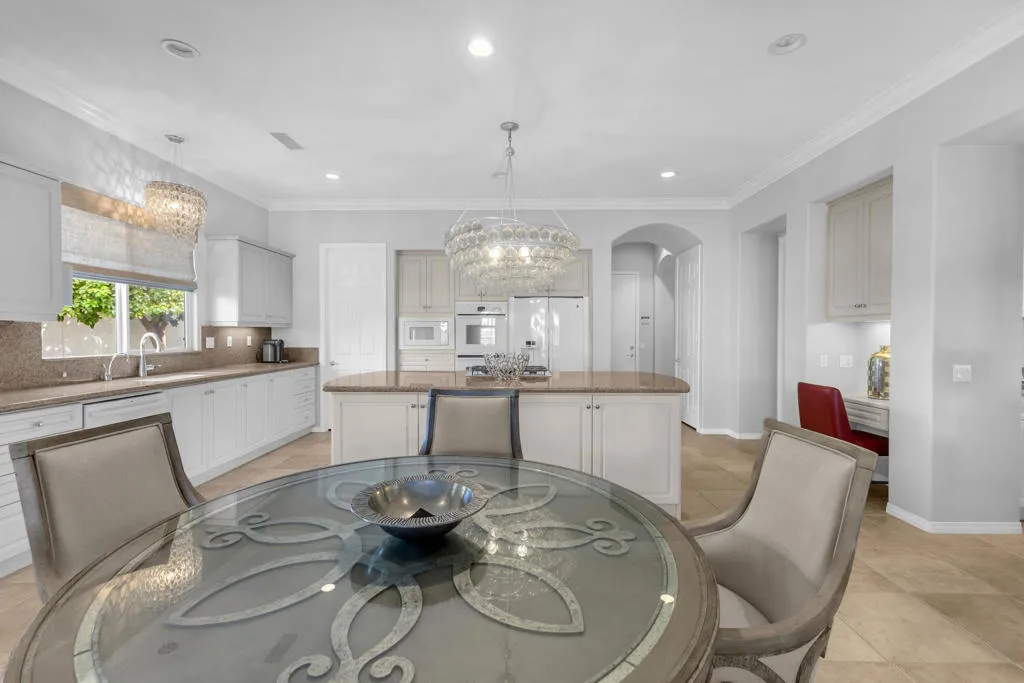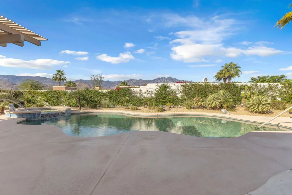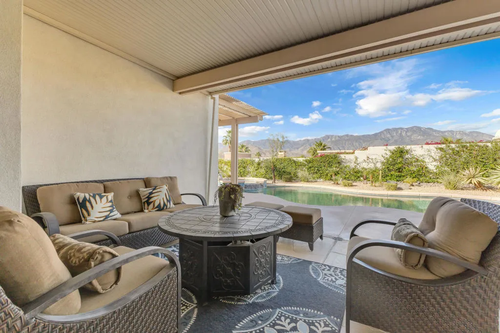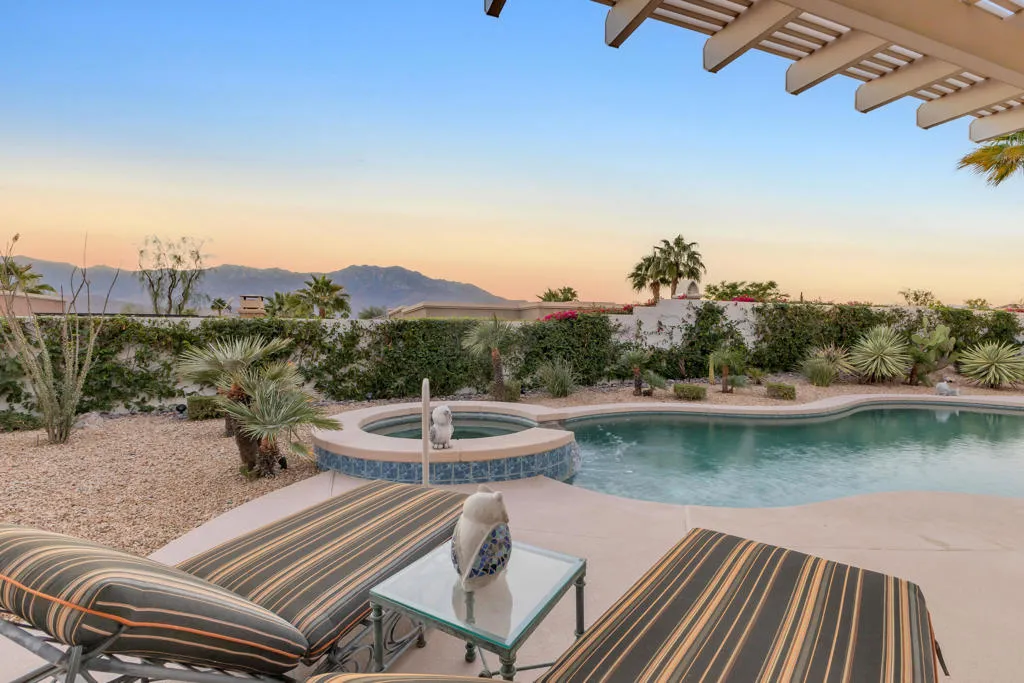Back on market at reduced price. The spectacular San Jacinto mountain views from both inside and out are the first of the many features in this gorgeous St. Augustine home. By the numbers, this is a 3 BR, office/den, 2.5 BA, 3650 sq ft home with a two car garage, and, a separate single car garage currently being used for storage and a workspace. Done in an early California style architecture, this home is a ”plan 4”, built by Ashbrook. The interior provides a spacious great room with a sparkling kitchen with a large island, a walk-in and a butler’s pantry and multiple dining areas. Porcelain tile, stylish carpetry, ten foot ceilings, and custom lighting are some of the interior flourishes. Outdoors, the grandness continues with a misting system, a salt, pebble style pool and spa, spillway and, a built-in BBQ which is nestled just under the spacious covered patio. The master bedroom suite has a large walk-in closet with built-ins, dual vanities, spa tub & separate shower. Did I mention the owned solar for both the house electric AND to heat the pool, and the newer HVACs (3 yo). This is a bright, yet cozy home, with custom lighting and large mirrors in the baths. There is mature landscaping with palm and citrus trees, and ground cover. Additional features include a front courtyard, double oven, 8 ft doorways, and 10 ft ceilings. The perfect home for entertaining! St Augustine is a gated community with a 7 acre park & tennis courts. Low ($400/month) HOA’s & no land lease.