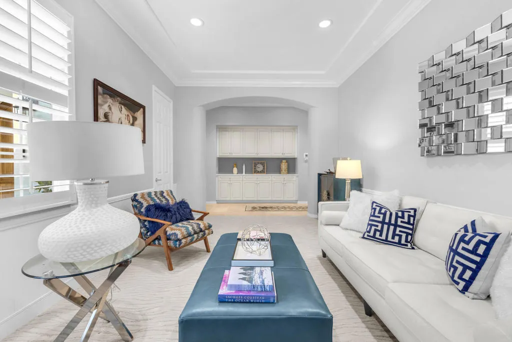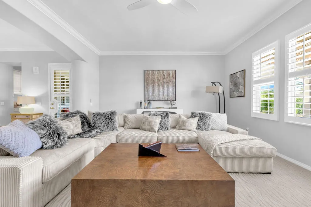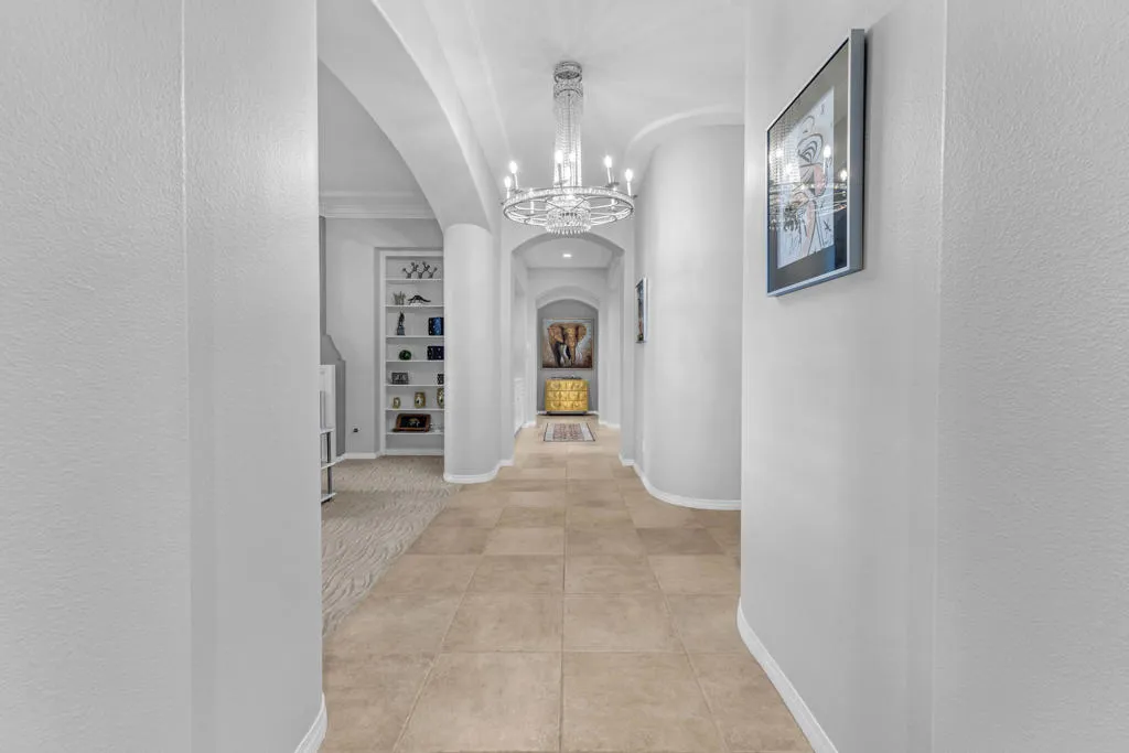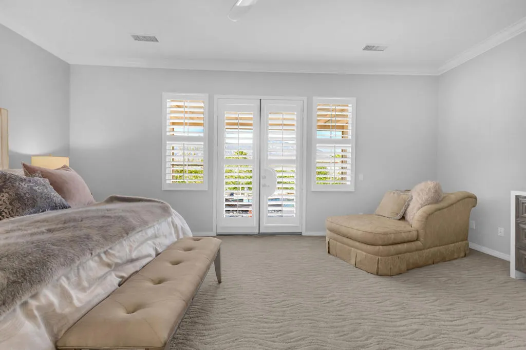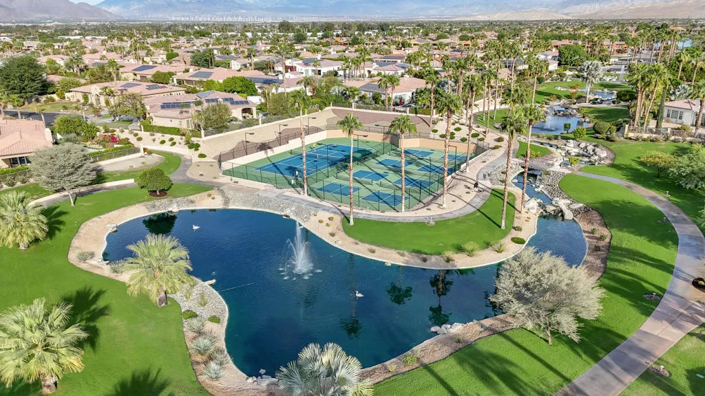 Back on market at reduced price. The spectacular San Jacinto mountain views from both inside and out are the first of the many features in this gorgeous St. Augustine home. By the numbers, this is a 3 BR, office/den, 2.5 BA, 3650 sq ft home with a two car garage, and, a separate single car garage currently being used for storage and a workspace. Done in an early California style architecture, this home is a ”plan 4”, built by Ashbrook. The interior provides a spacious great room with a sparkling kitchen with a large island, a walk-in and a butler’s pantry and multiple dining areas. Porcelain tile, stylish carpetry, ten foot ceilings, and custom lighting are some of the interior flourishes. Outdoors, the grandness continues with a misting system, a salt, pebble style pool and spa, spillway and, a built-in BBQ which is nestled just under the spacious covered patio. The master bedroom suite has a large walk-in closet with built-ins, dual vanities, spa tub & separate shower. Did I mention the owned solar for both the house electric AND to heat the pool, and the newer HVACs (3 yo). This is a bright, yet cozy home, with custom lighting and large mirrors in the baths. There is mature landscaping with palm and citrus trees, and ground cover. Additional features include a front courtyard, double oven, 8 ft doorways, and 10 ft ceilings. The perfect home for entertaining! St Augustine is a gated community with a 7 acre park & tennis courts. Low ($400/month) HOA’s & no land lease.
