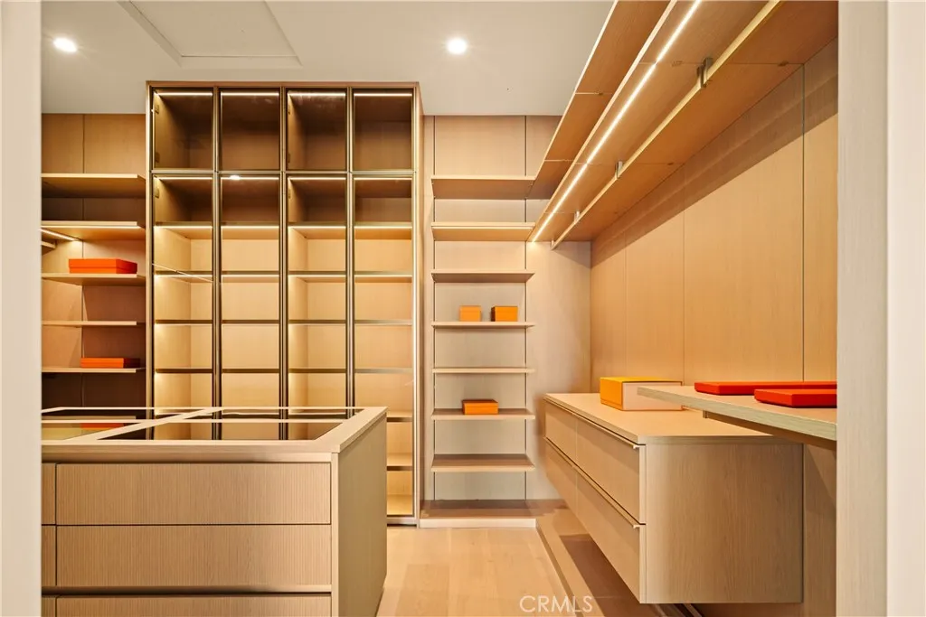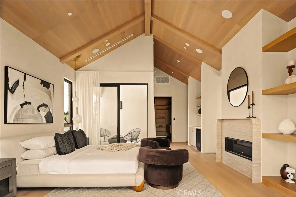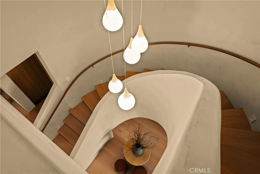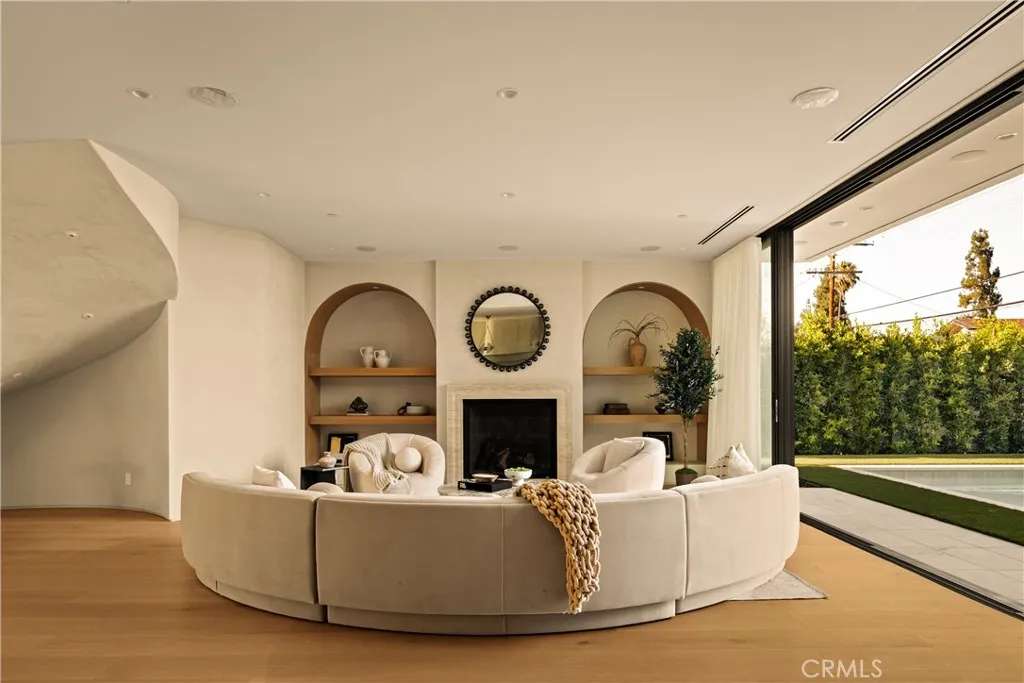 Inside, soaring ceilings, a striking spiral staircase, and wide-plank French oak floors set the tone. The chef’s kitchen features an oval Quartzite island, Quartzite countertops, Thermador appliances, and custom cabinetry, opening seamlessly to the backyard. The living room is anchored by a marble fireplace, while a private office offers flexibility as a workspace or additional bedroom. The primary suite includes dual walk-in closets, a stone fireplace, spa-like bath, and a 300-sq-ft balcony.