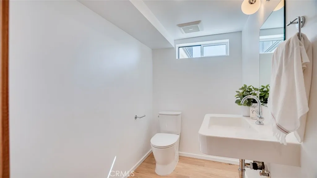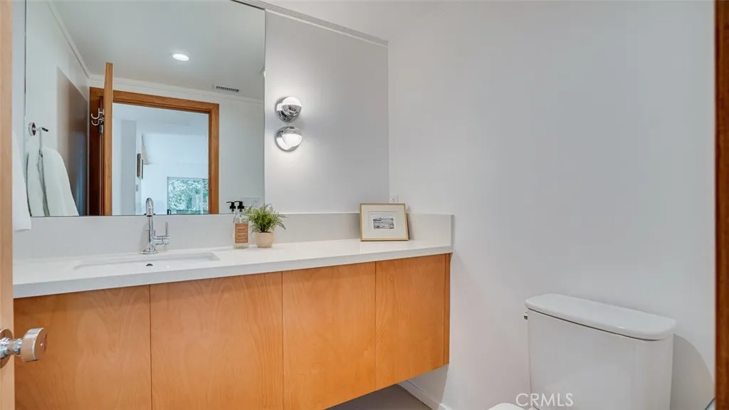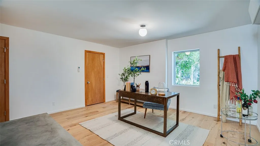 Walls of glass bathe the main house in natural light and frame breathtaking, unobstructed views of Downtown Los Angeles from nearly every room. The first level features a chef’s kitchen with stainless steel appliances and sleek birch cabinetry, flowing effortlessly into the dining and living areas—each anchored by polished ceramic concrete floors.