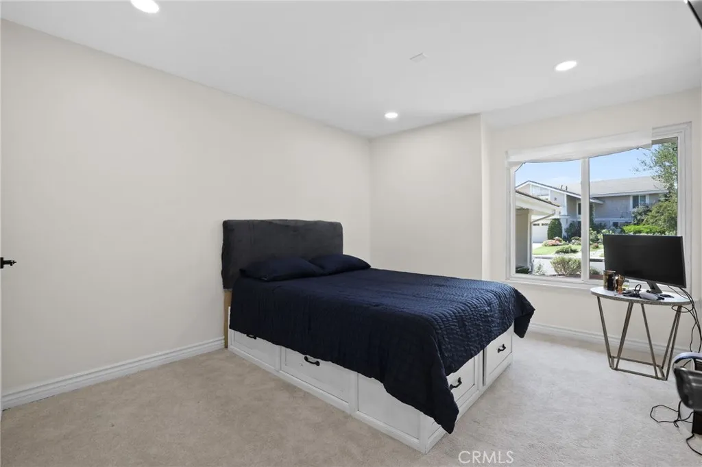 The primary suite offers large windows with views of the backyard, generous storage, and a remodeled bath with dual sinks, a walk-in shower, and a sauna. Two additional bedrooms each feature their own full bathrooms—all three bathrooms include walk-in showers, providing exceptional comfort and convenience.