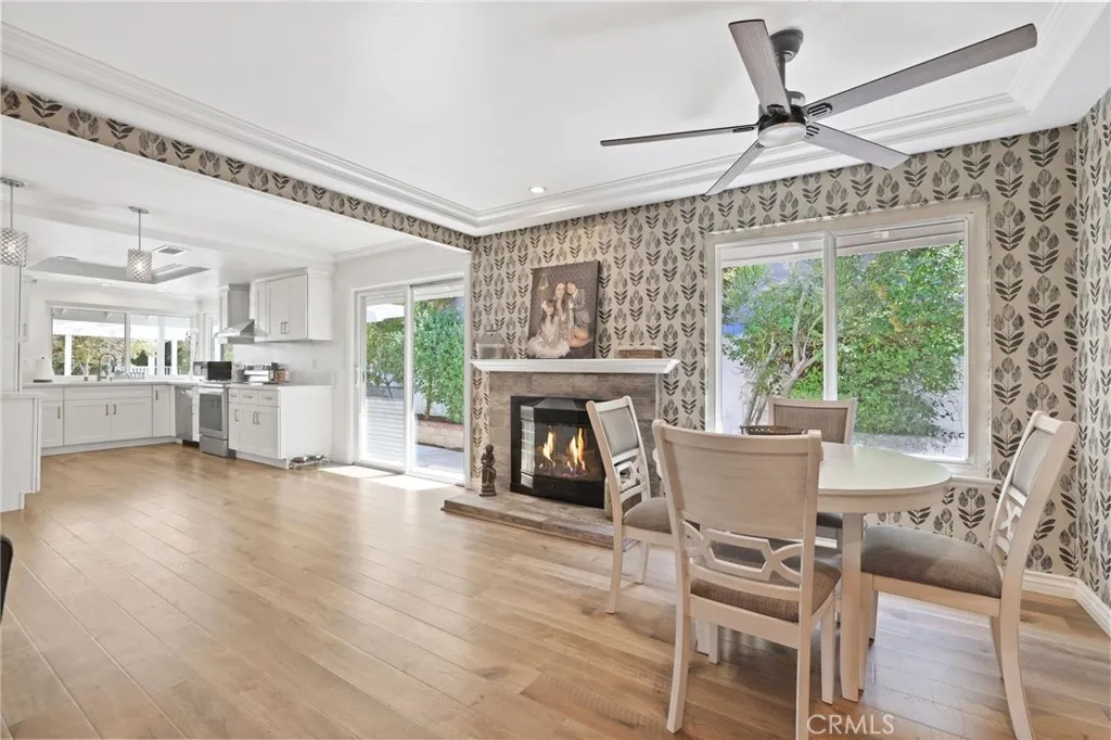 The remodeled kitchen features marble-look counters, stainless steel appliances, a stylish backsplash, and a breakfast nook opening to the family room with a cozy fireplace. Folding patio doors and an added side patio door provide seamless indoor-outdoor flow to the private backyard with mature landscaping, a large covered patio, and a rectangular, usable lot with wider-than-average side yards.