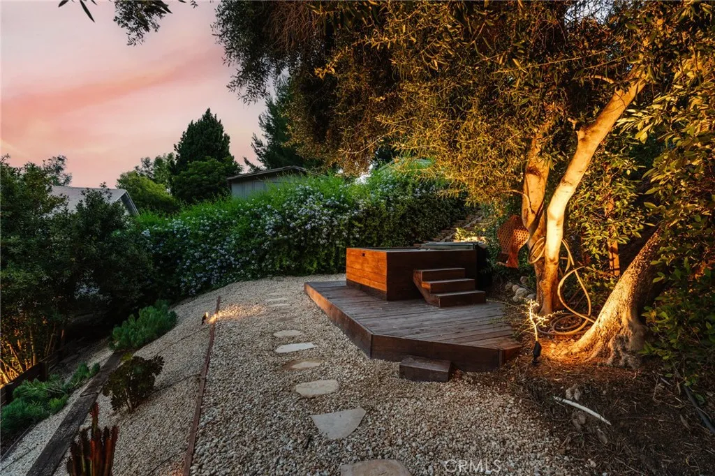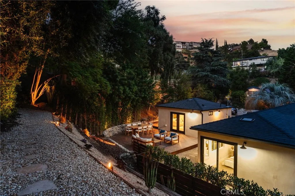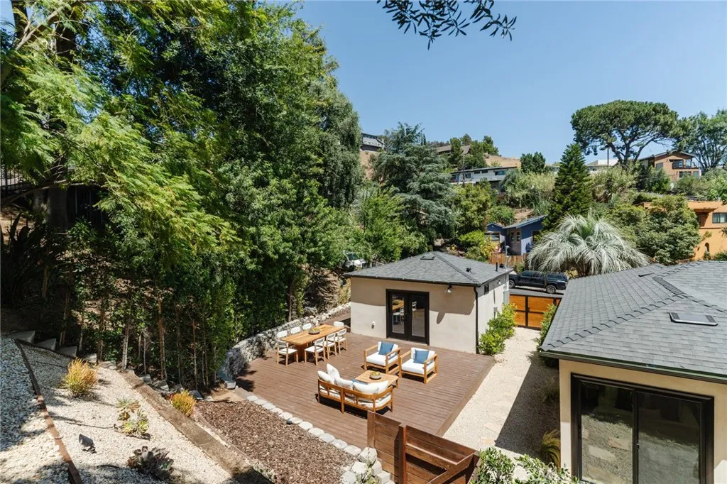 A private hilltop sanctuary on a quiet street north of York, this creative Highland Park compound offers the perfect balance of thoughtful design, lush landscaping, and prime location. Set on large 9,996 sq ft lot and surrounded by mature trees, vineyard vines, and natural greenery, it feels like a retreat, just moments from York Blvd. The main home features 3 bedrooms and 2 bathrooms. Inside, white oak flooring, lime-washed walls, and expansive picture windows create a bright, airy ambiance with seamless indoor-outdoor flow. The open kitchen is a showstopper, outfitted with leather-finish quartzite countertops, light wood cabinetry, and premium appliances. Just beyond, a detached and beautifully finished casita/ADU awaits, complete with a stylish kitchenette and full bathroom. Whether used as a guest suite, creative studio, office, or income-generating rental, it’s a flexible space that adds tremendous value and function to the property. The primary suite is a peaceful haven with sliding doors to a private patio and a spa-inspired bath featuring a double vanity and walk-in shower. Step outside to find a resort-style outdoor experience: a wooden deck for dining and lounging, a hot tub under the stars, a cozy firepit, and a terraced garden accessible by stone steps—all set against sweeping hillside views. Located in a tranquil pocket just blocks from Highland Park favorites like Belle’s Bagels, Kumquat Coffee, El Huarache Azteca, Queen St, Cafe de Leche, The York, Hermosillo, Joy, Sticky Rice, and more, this property offers the ideal mix of retreat and urban vibrance. With its inspired layout, multiple outdoor living areas, and detached guest house, this one-of-a-kind creative compound is Highland Park living at its best.