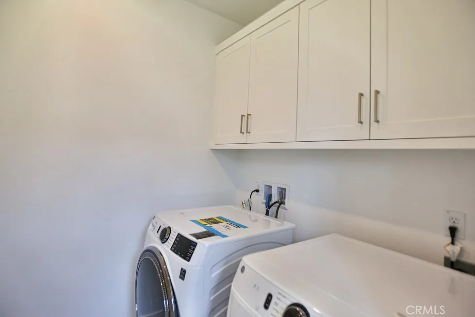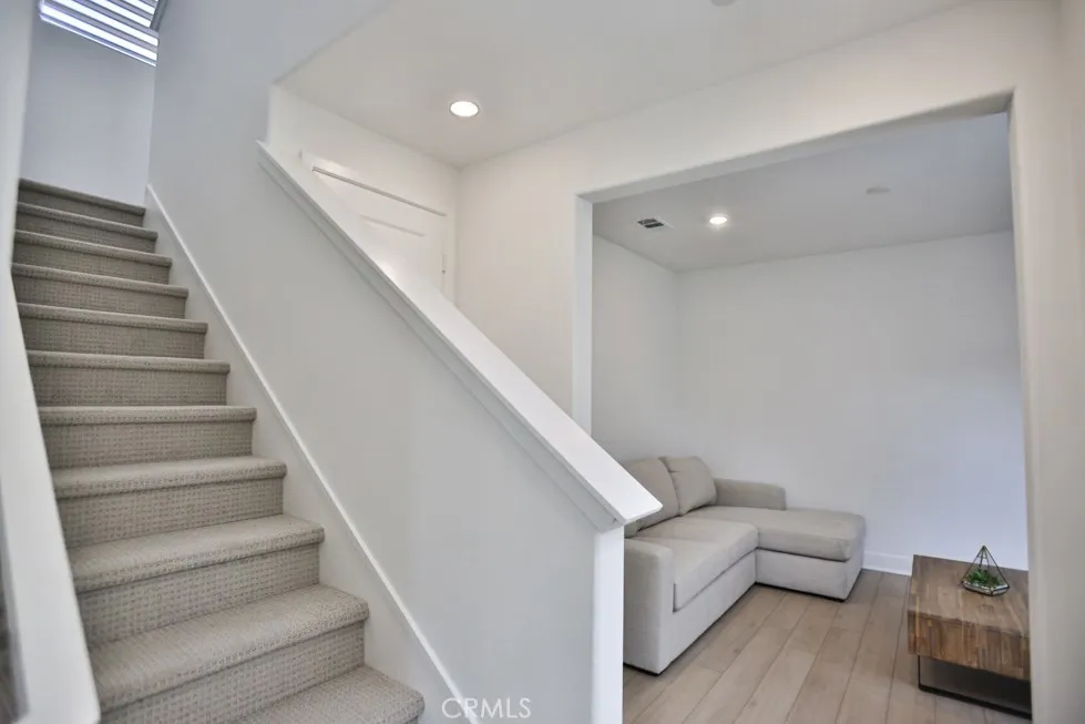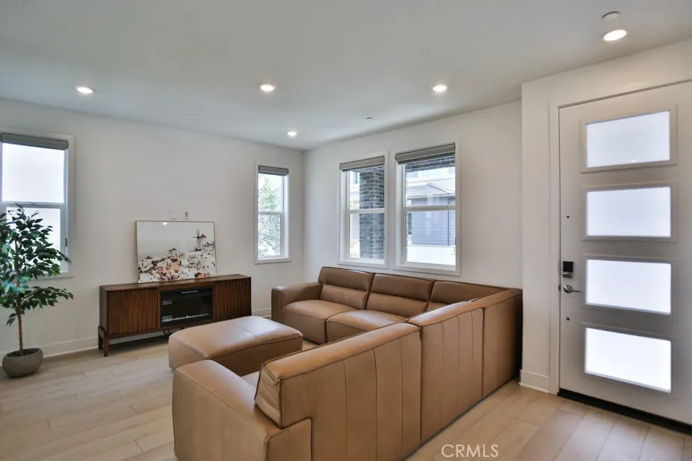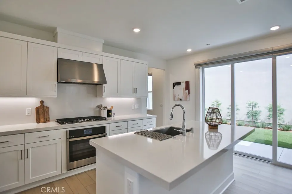 The open-concept main floor is anchored by a chef’s kitchen with quartz countertops, white shaker cabinetry, a 5-burner cooktop, built-in oven, and stainless steel appliances. Natural light pours in through expansive stackable sliding glass doors, blurring the line between indoors and out. Step into your private yard, complete with artificial turf and drought-tolerant landscaping—a low-maintenance oasis perfect for dining al fresco, hosting friends, or simply enjoying Orange County’s year-round sunshine.