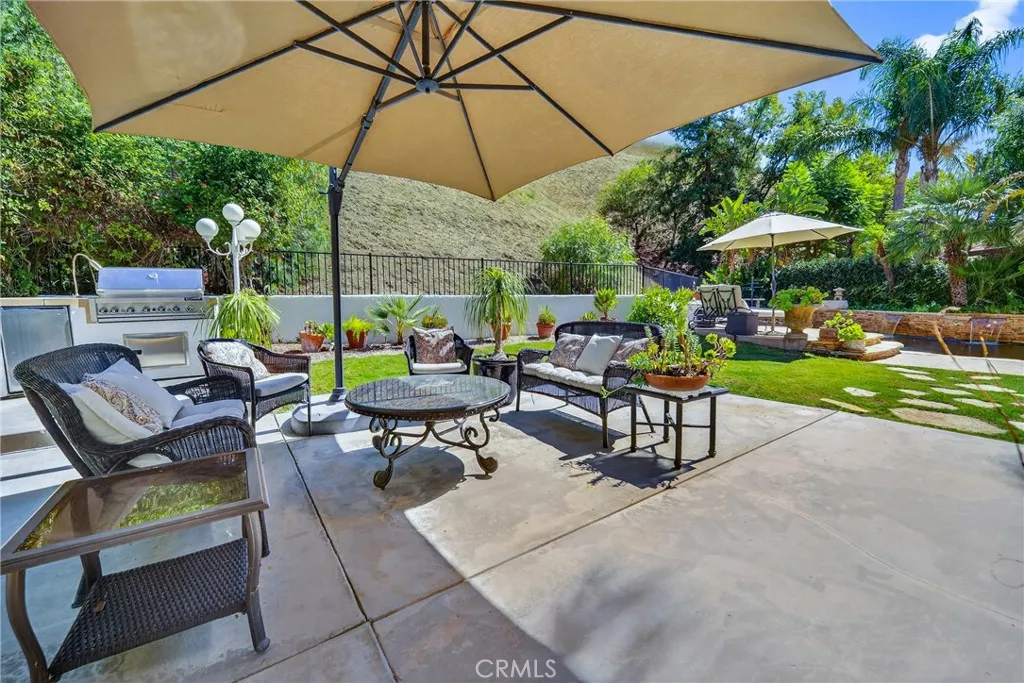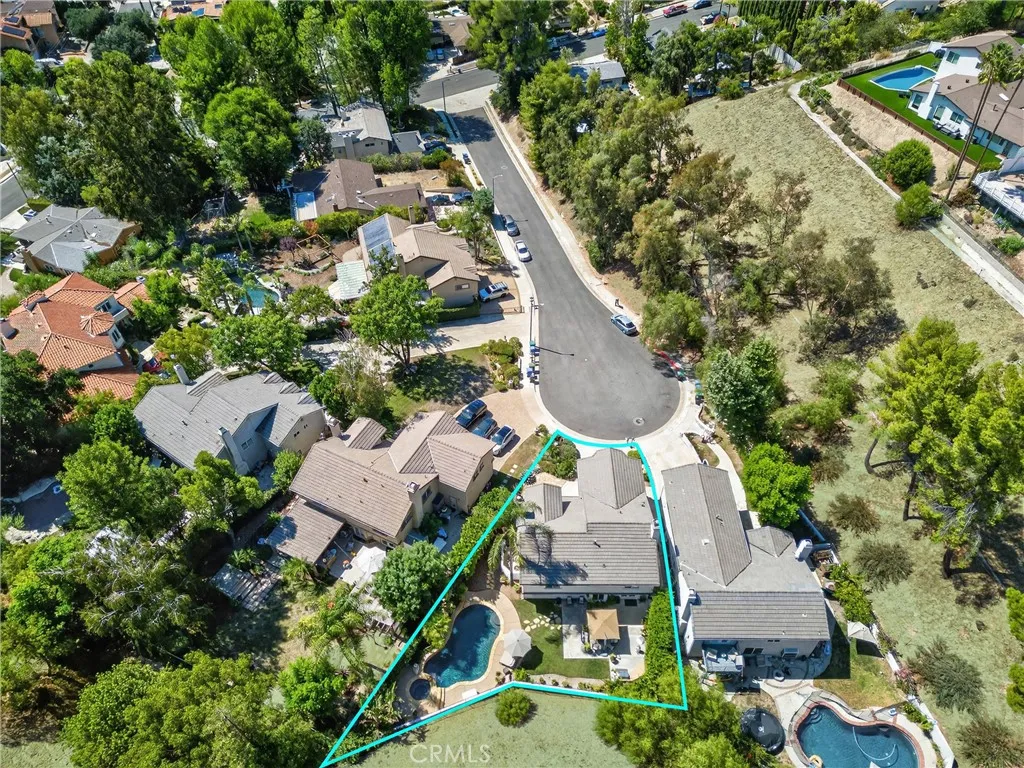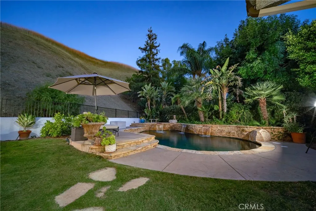 Located in one of Calabasas’ most desirable neighborhoods and within the award-winning Las Virgenes Unified School District, assigned to highly rated schools including Lupin Hill Elementary, A.E. Wright Middle, and Calabasas High, this 4-bedroom, 2.5-bathroom home offers nearly 2,500 sq ft of living space on an expansive 13,255 sq ft lot. Nestled at the end of a peaceful cul-de-sac and surrounded by rolling hills with striking mountain views, the property provides both privacy and an ideal family-friendly setting. Double doors open to a dramatic foyer where a grand staircase, soaring ceilings, and travertine floors with custom inlays create a striking first impression. The formal living room features a vaulted beamed ceiling, centerpiece fireplace, and floor-to-ceiling windows that bathe the space in natural light, flowing seamlessly into the formal dining room with a tray ceiling and backyard views. The gourmet kitchen boasts granite countertops, stainless-steel appliances including a 6-burner Viking range with double oven and matching hood, and a breakfast peninsula that opens to the inviting family room with its own fireplace and French doors to the outdoors. Designed for entertaining, the backyard is a private paradise with a built-in barbecue, lush lawn, sparkling pool and spa with cascading waterfalls, and mature tropical landscaping set against a backdrop of hillsides and treetops. Completing the main level are a powder bath, laundry room, and direct access to the attached 2-car garage. Upstairs, a spacious landing overlooks the living room and leads to four bright bedrooms, each with hillside or mountain views. The primary suite features vaulted tray ceilings, a bay window nook, walk-in closet, and a beautifully upgraded en-suite bath showcasing marble flooring, artisan tile work, and dual sinks, while the secondary bedrooms share a well-appointed hall bath with a dual vanity and matching upgrades of marble and artisan tile finishes. All this is just minutes from The Commons at Calabasas, the Civic Center, local dining, hiking trails, and convenient freeway access, offering the perfect blend of comfort, convenience, and resort-style living.
