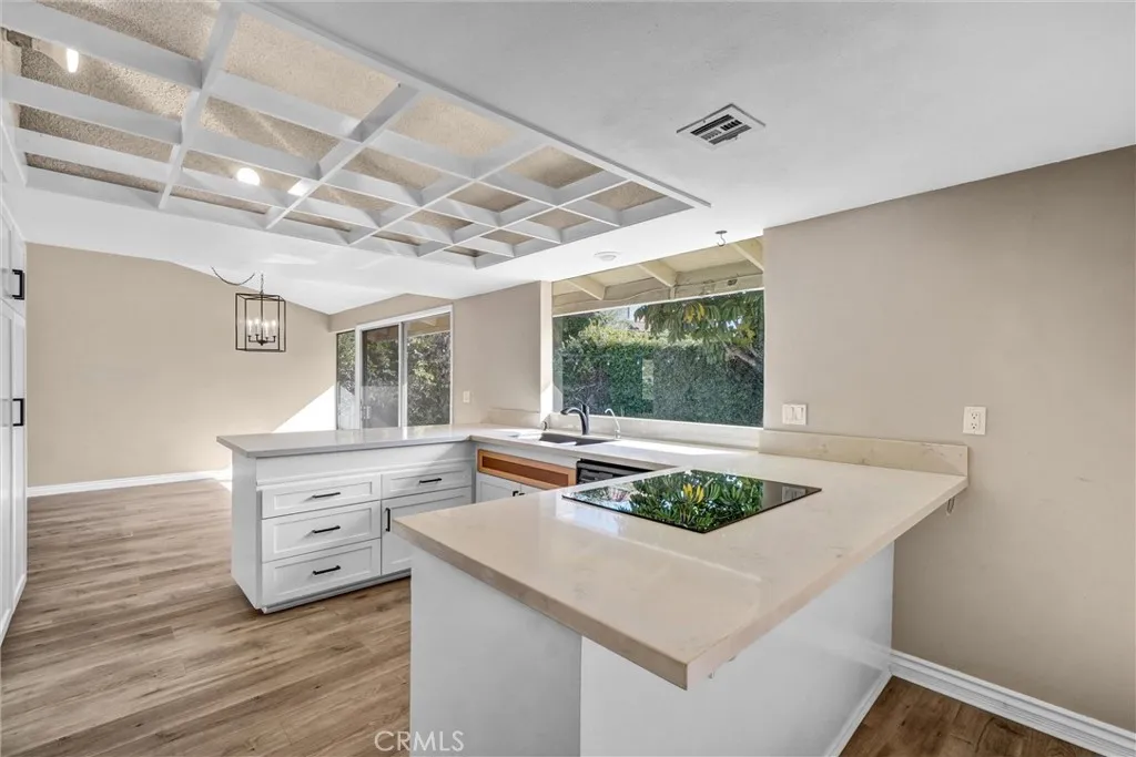 Inside, the open floor plan highlights sun-filled living and dining areas with elevated ceilings, a cozy fireplace, and sliding door access to the pool. The renovated kitchen offers views of the backyard oasis, plenty of natural light, and an electric stovetop.