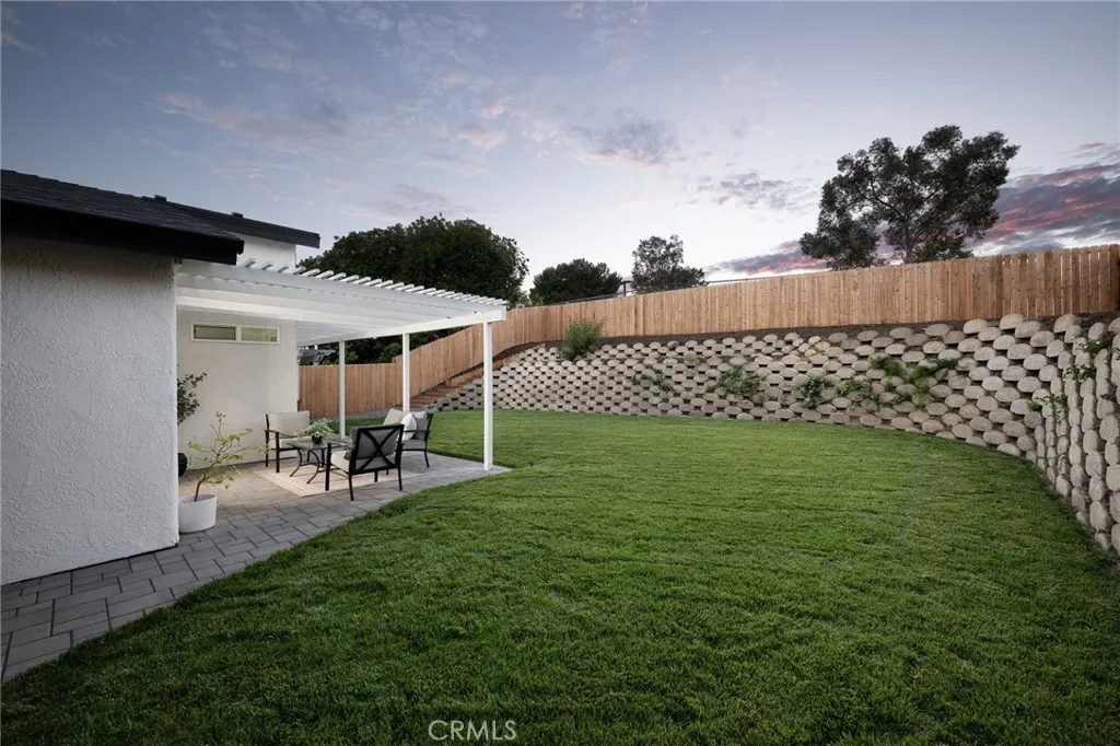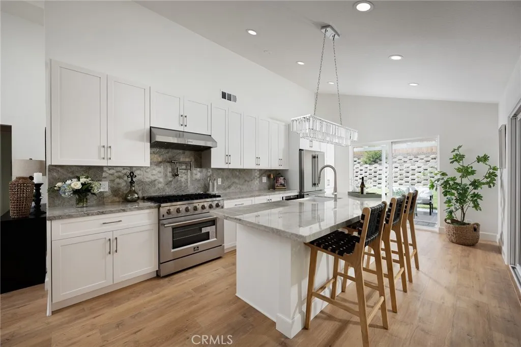 Inside you’ll be welcomed by soaring vaulted ceilings and a bright, open living space that flows seamlessly into the chef’s kitchen. Outfitted with restaurant-grade Forno appliances, sleek custom cabinetry, and quartz counters, this kitchen was built for both style and performance. A 12-foot sliding French door opens to the new patio and modern pergola, creating the ultimate indoor-outdoor living experience. The 6,000+ sq. ft. flat backyard offers endless possibilities for entertaining, gardening, or simply relaxing in the California sunshine.