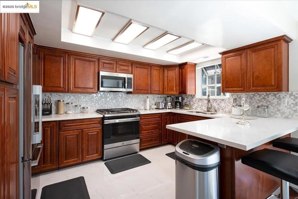 Welcome to this beautifully remodeled residence in Oakland’s highly sought-after Grass Valley neighborhood. This stunning home features an expansive main living level, perfect for entertaining and currently styled as a sophisticated gathering space. The chef’s kitchen is the heart of the home, anchored by gleaming Carrara countertops and enhanced by premium flooring throughout. On cooler evenings, cozy up beside the fireplace as soft, ambient light fills the space, creating a warm and inviting atmosphere. First Floor: The entry level offers a garage with interior access, dedicated storage space, a comfortable living area, a full bathroom, and two well-appointed bedrooms—ideal for guests, extended family, or flexible work-from-home needs. Second Floor: Upstairs, enjoy the open-concept kitchen, living, and dining areas, along with three additional bedrooms. Two full bathrooms are located on this level, including a luxurious primary bath featuring a skylight and jetted tub. Step outside to a spacious private deck that leads down to the yard via elegant spiral stairs—perfect for seamless indoor/outdoor living. With a prime location near Knowland Park and easy access to the 580 freeway, this home offers the perfect combination of elevated style, comfort, and convenience.