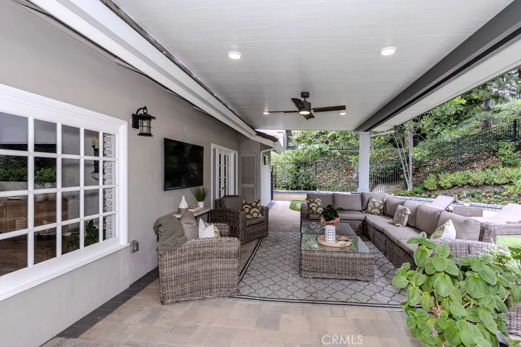 Single-story 3-bedroom 2-bath view home at 581 S Paseo Carmel in Anaheim Hills offers city lights and mountain vistas along with a spacious primary suite and a backyard retreat built for entertaining. The property begins with great curb appeal, wood siding with brick accents, and a landscaped approach. A covered entry functions as a front patio seating area and sets a welcoming tone. Inside, wood-look tile flooring runs throughout with no interior steps. The main living area opens under vaulted wood beam ceilings with abundant natural light, creating a bright and open feel that blends into the dining area. A hallway with a double-door storage closet leads toward the family room, where vaulted ceilings continue above a tall whitewashed brick fireplace wall. The family room flows into a kitchen nook finished with wainscoting and wood accents, positioned beside large windows for natural light. The kitchen is anchored by a peninsula counter and finished with granite countertops, a herringbone marble mosaic backsplash, recessed lighting, and a deep sink. A garden bay window offers extra display space. Appliances include a gas cooktop, oven, dishwasher, and trash compactor. Pull-out drawers add convenience, and the adjacent dining space accommodates a full table. The primary suite features double door entry, vaulted ceilings with a ceiling fan, dual mirrored wardrobes, and French doors with operable side windows. Its en suite bath offers dual granite vanities, a walk-in shower with seating bench, a private water closet, and large travertine tile finishes. The second bedroom, also with double-door entry, is used as an office with ceiling fan and mirrored closet, while the third bedroom includes the same. The guest bath is a full bath with granite vanity and large travertine tile shower surround. The laundry room is inside with overhead cabinetry. The attached two-car garage provides direct access, storage cabinets, and overhead racks. The backyard is designed as an entertainer’s retreat, featuring a large Luminwood patio cover with recessed lighting and dual ceiling fans, paver hardscape, built-in barbecue with bar seating, a decorative glass gas fireplace, turf, and a putting green. Mature trees along the rear add privacy while framing the city lights and mountain views. Located minutes from shopping, dining, and parks with nearby access to freeways and award-winning schools, this property offers a single-level lifestyle with outdoor amenities and relaxing views