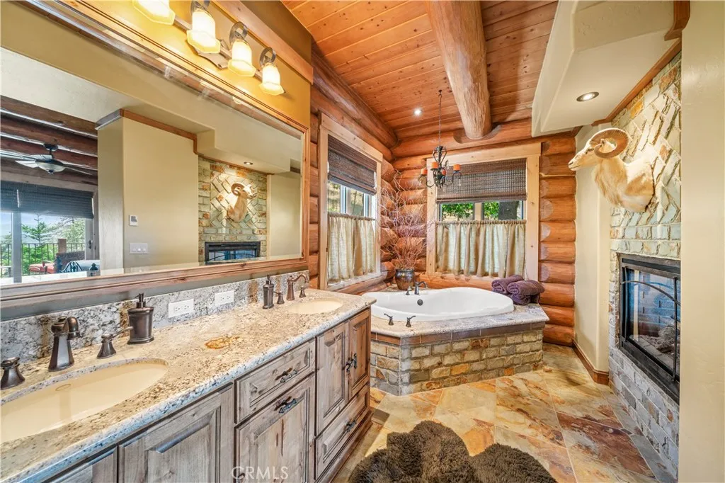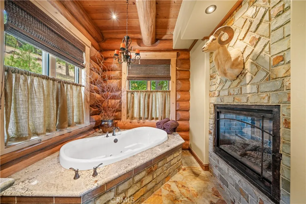 Main Level: Luxurious primary suite featuring a stone fireplace, spa inspired jacuzzi tub, radiant heated floors, dual vanities, walk-in closet, and a private balcony with mountain views; expansive living area with soaring ceilings and a Mcgregor Lake Ledge stone fireplace; gourmet kitchen equipped with Viking appliances, reverse osmosis, triple thick leathered granite counters, custom alder/hickory cabinets, and an integrated BBQ station.