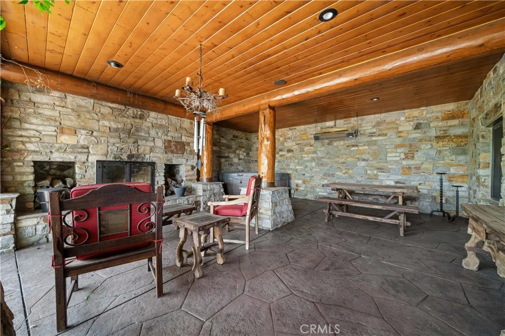 Outdoor Oasis: Vast natural stone decks with propane BBQ, sink, fire pit areas, horseshoe pit, and multiple seating spots; secluded, tree lined acreage with sweeping views and outdoor gathering spaces. Added benefits: Finished garage with storage, dual zone HVAC, custom motorized gate, whole house fan, large water heater and water softener.