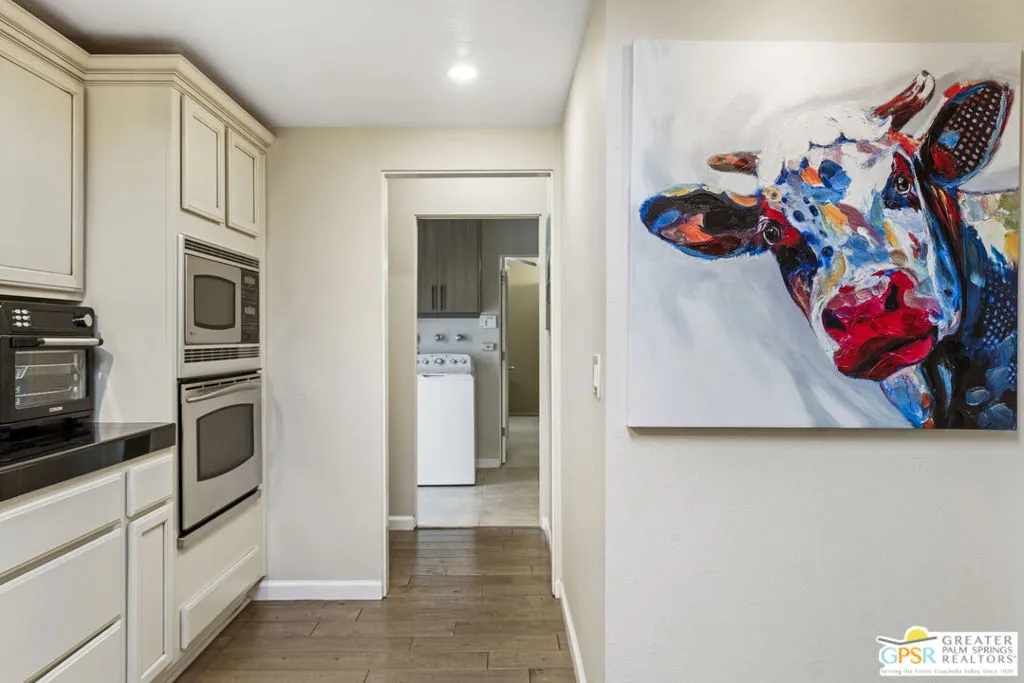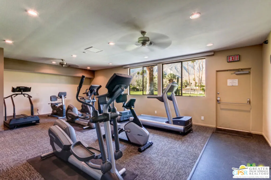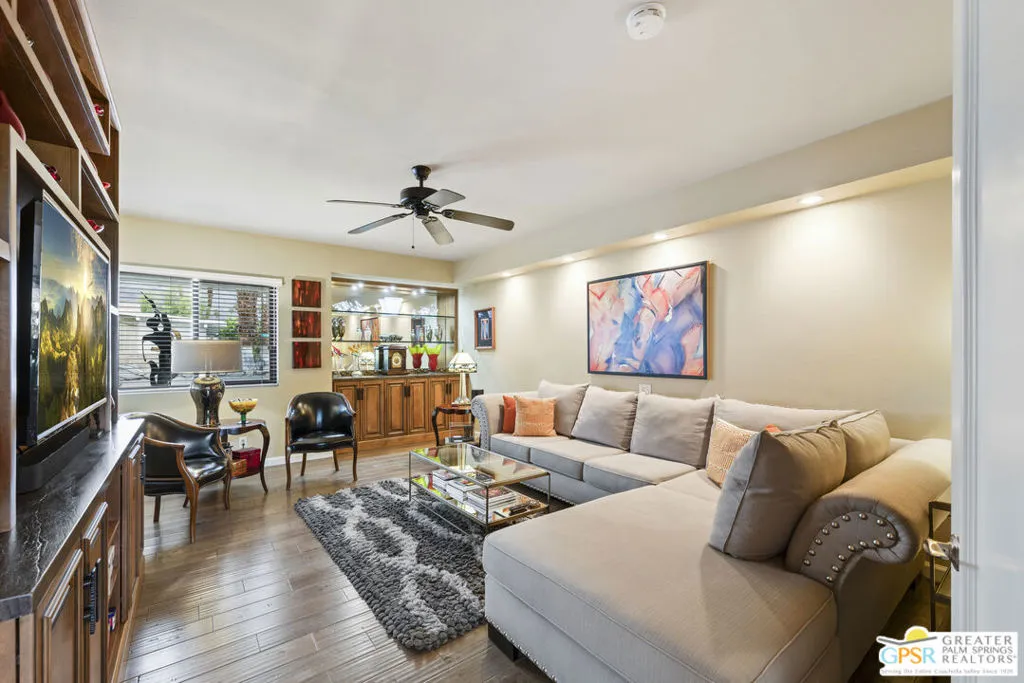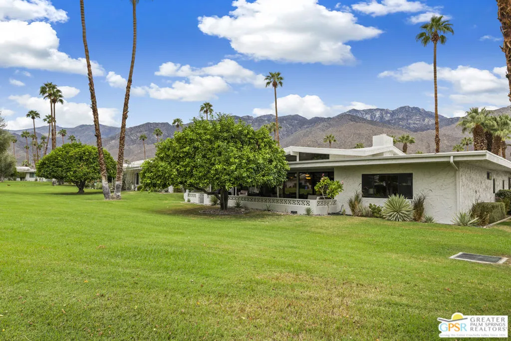 Experience Mid-Century Modern Living in Canyon Estates! Discover the hallmark of mid-century modern architecture in the sought-after Canyon Estates community, where acclaimed architect Charles E. Du Bois designed homes that blend timeless style, comfort, and sophistication – perfectly capturing the quintessential Palm Springs iconic lifestyle. Step through an elegant reeded glass double-door entry into a welcoming foyer that opens to a stunning living room, complete with a signature umbrella open beam style ceiling. Walls of glass and iconic clerestory windows frame dramatic east-facing mountain views and invite abundant natural light. The space flows seamlessly to a broad, covered patio overlooking a serene greenbelt with the mountains beyond – ideal for indoor-outdoor entertaining. A floor to ceiling stone-clad fireplace with white marble hearth and “Rat Pack” ready wet bar add to the authentic Palm Springs vibe. This thoughtfully upgraded, move-in-ready home is furnished in a warm neutral palette and features: 2 great ensuite primary bedrooms plus 2 additional bedrooms (currently used as a den and office), 3 well- appointed bathrooms, custom wood built-ins in the den, add functionality and elegance. Modern upgrades include all new Milgard windows, doors, and clerestory windows. A bonus eat-in breakfast area is perfect for morning coffee and extended views. This and much more in easy single level luxury living. Residents enjoy an array of amenities, including 15 pools, 12 spas, tennis and pickleball courts, a PAR-3 golf course, and a clubhouse with a newly upgraded fitness center. These offerings foster an active and social lifestyle in a resort-like environment. With its low-density layout, Canyon Estates provides generous open spaces, a peaceful setting, and a true sense of community.